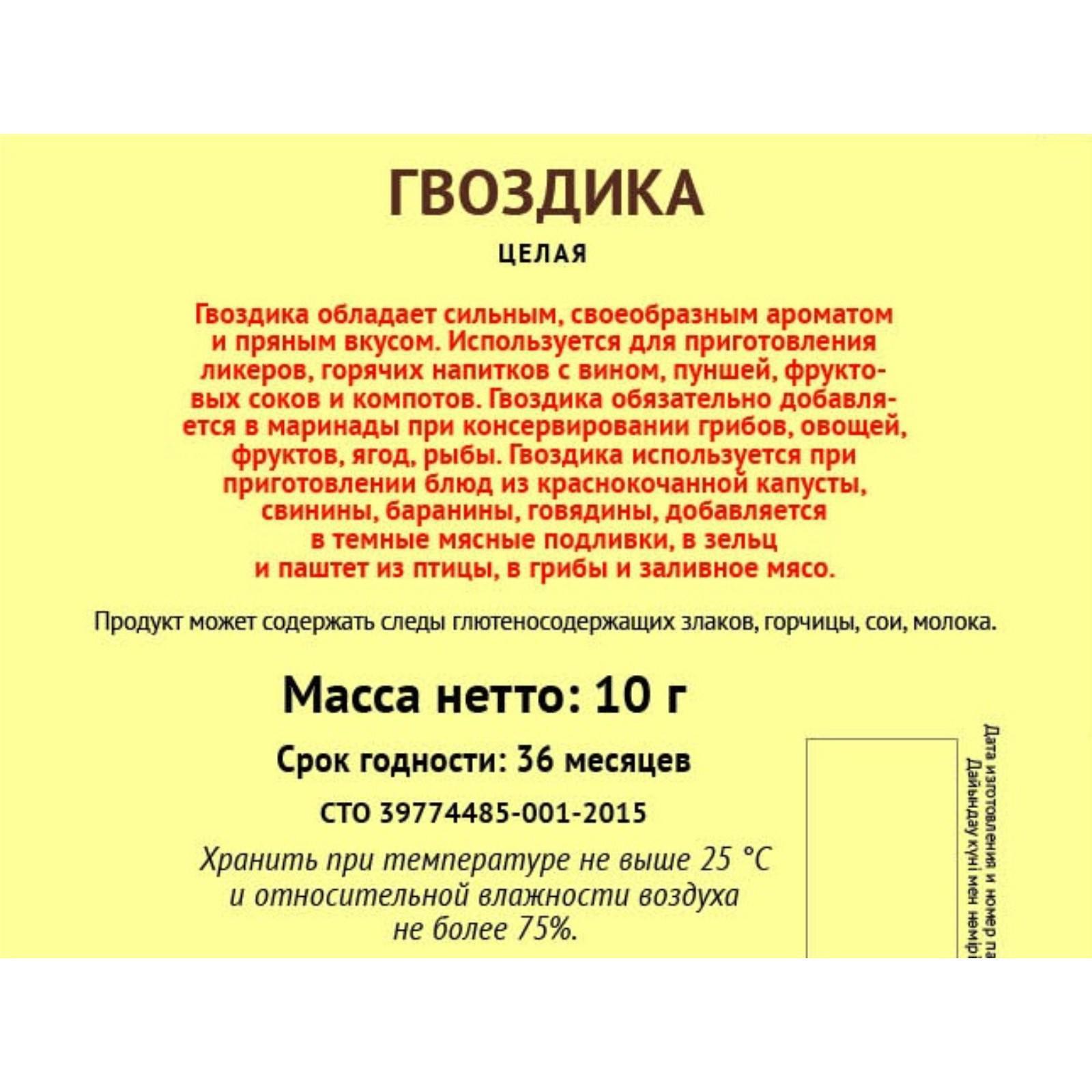 Гвоздика обладает сильным, своеобразным ароматом и пряным вкусом. Используется для приготовления ликеров, горячих напитков с вином, пуншей, фруктовых соков и компотов. Гвоздика обязательно добавляется в маринады при консервировании грибов, овощей, фруктов, ягод, рыбы. Гвоздика используется при приготовлении блюд из краснокочанной капусты, свинины, баранины, говядины, добавляется в темные мясные подливки, в зельц и паштет из птицы, в грибы и заливное мясо.