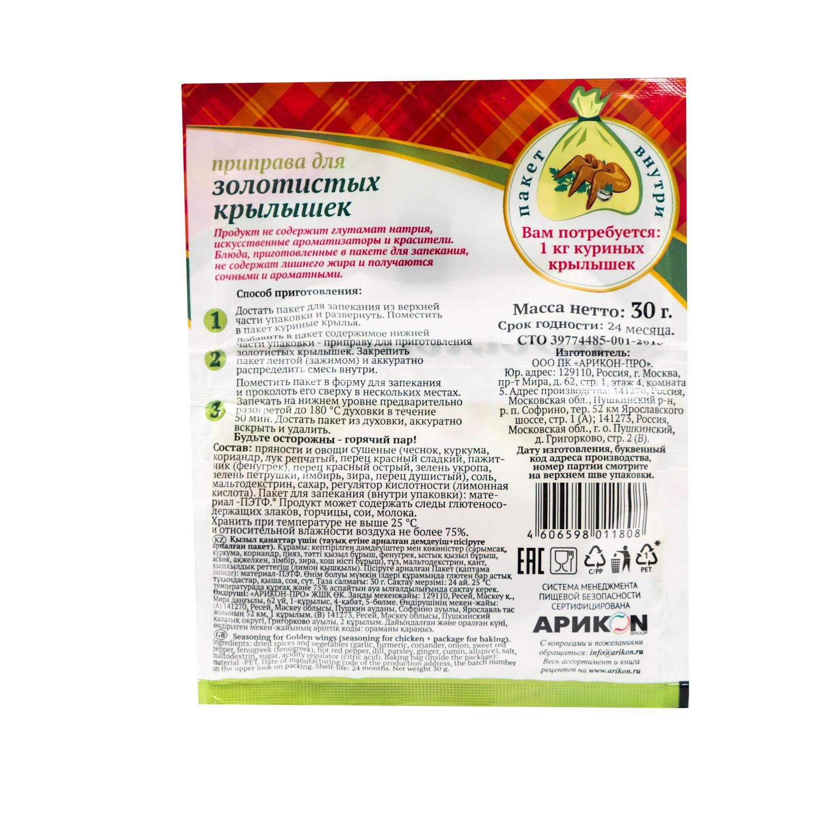 Назначение: приправа для запекания золотистых крылышек. Пакет для запекания внутри.