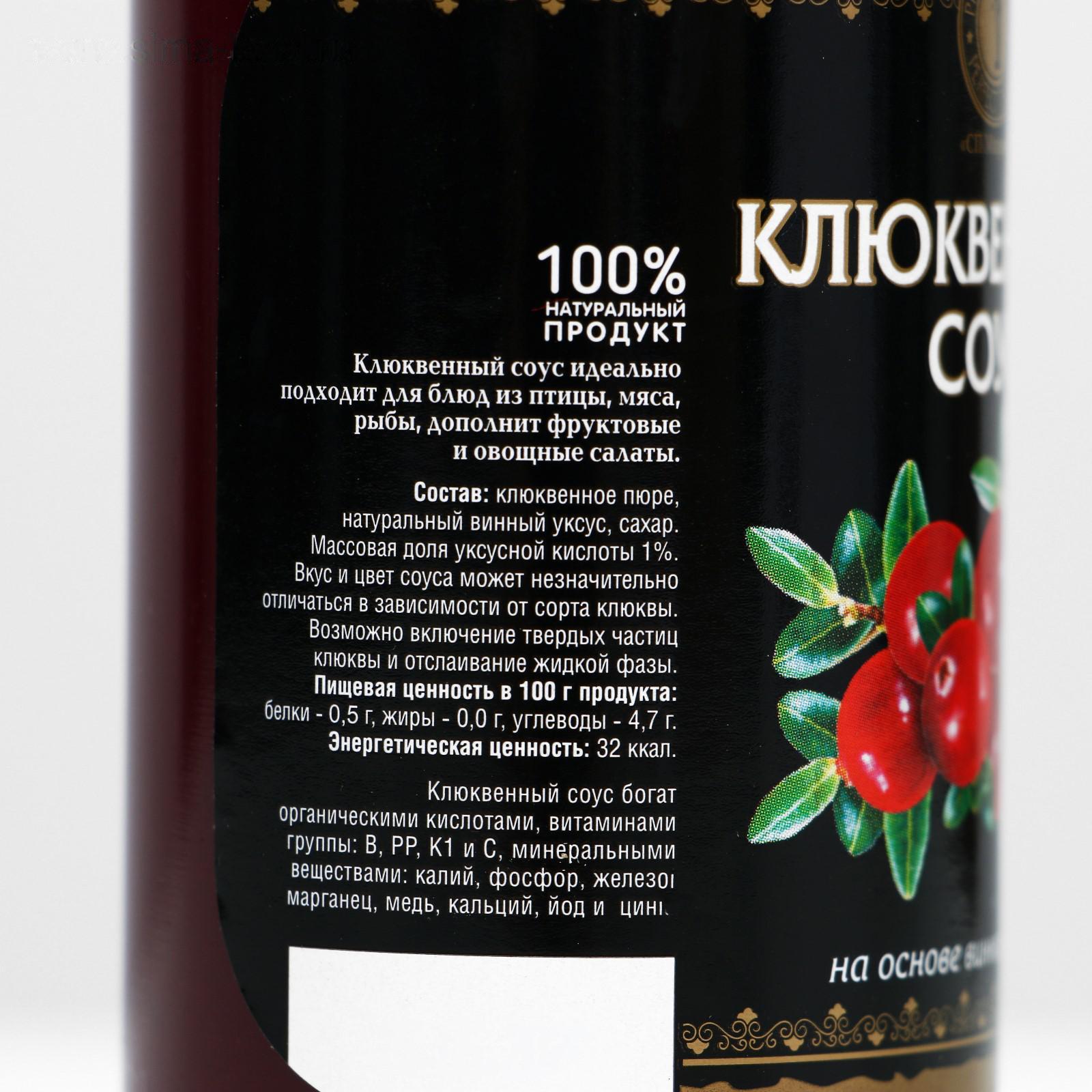 Состав: клюквенное пюре, натуральный винный уксус, сахар. Массовая доля уксусной кислоты 1 %. Вкус и цвет соуса может незначительно отличаться в зависимости от сорта клюквы. Возможно включение твёрдых частиц клюквы и отслаивание жидкой фазы.