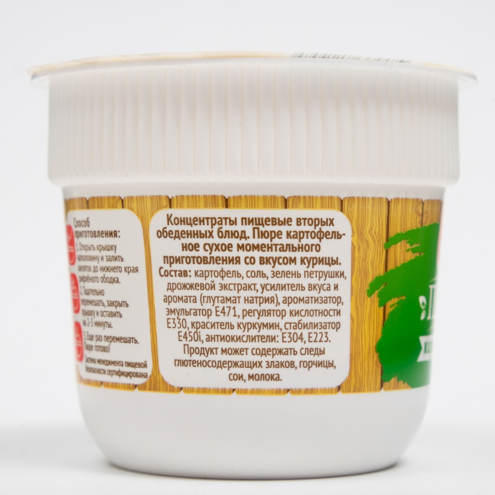 Состав: лимонная кислота, ароматизатор, соль, картофель, лук репчатый, эмульгатор е471, куркумин, стабилизатор е406, зелень петрушки, дрожжевой экстракт, глутамат натрия, антиокислитель Е223 Е304i.