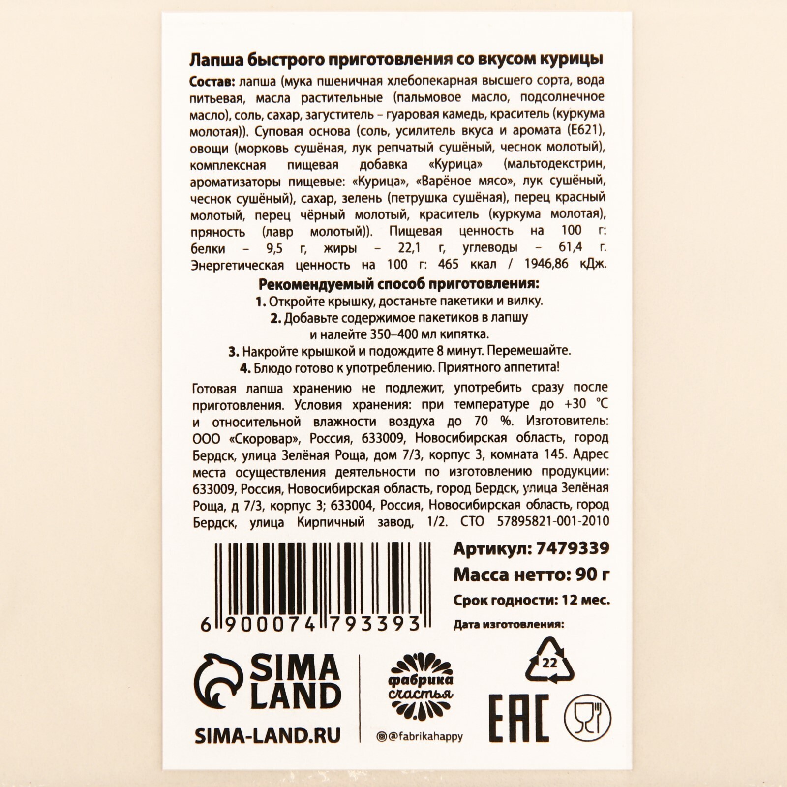 Состав: лапша (мука пшеничная хлебопекарная высшего сорта, вода питьевая, масла растительные (пальмовое масло, подсолнечное масло), соль, сахар, загуститель – гуаровая камедь, краситель (куркума молотая)). Суповая основа (соль, усилитель вкуса и аромата (Е621), овощи (морковь сушёная, лук репчатый сушёный, чеснок молотый), комплексная пищевая добавка «Говядина» (мальтодекстрин, глюкоза, дрожжевой экстракт, ароматизаторы пищевые: «Говядина», «Жареное мясо», перец красный молотый, сахар, зелень (петрушка сушёная), пряности (кориандр молотый, карри), краситель (куркума молотая)).