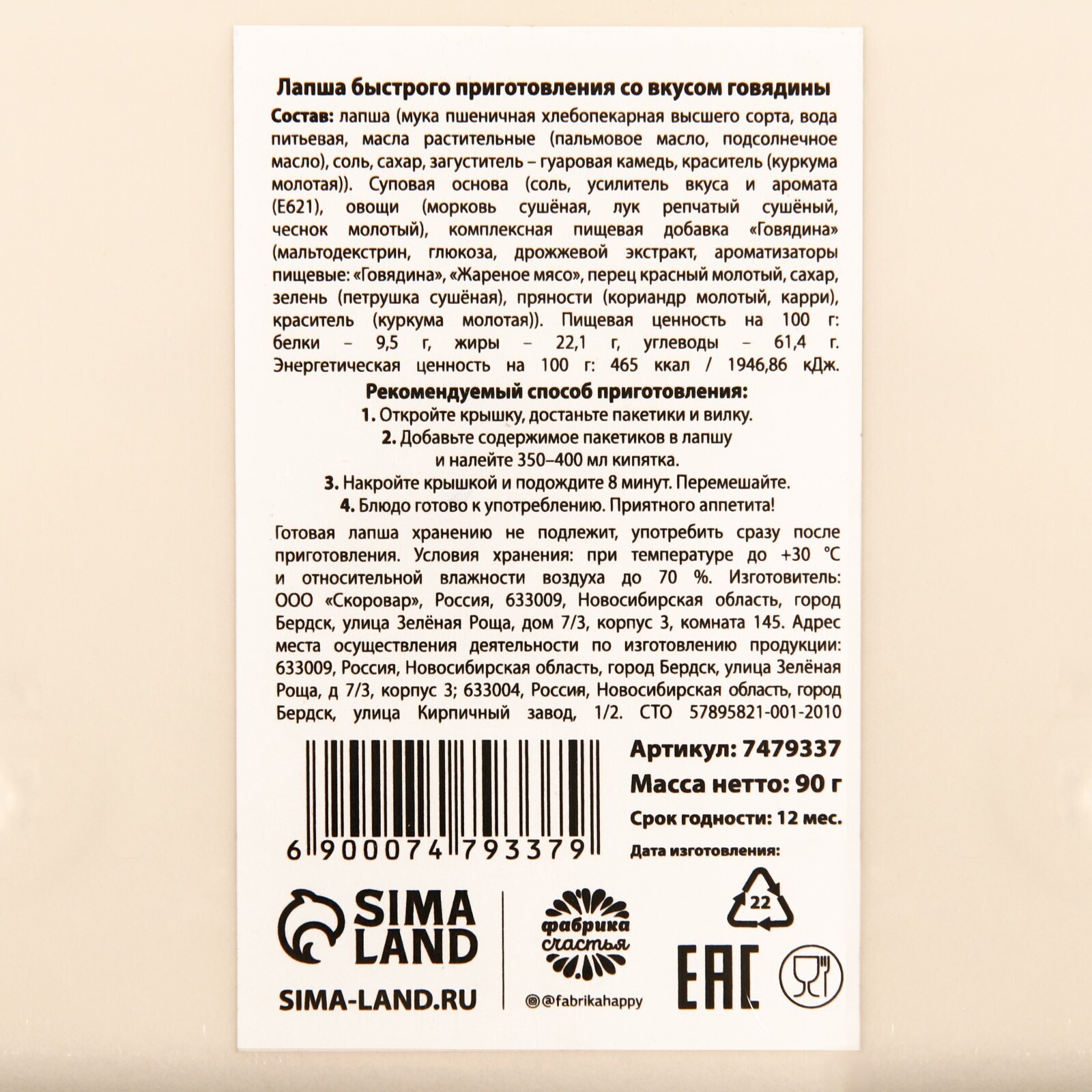 Состав: лапша (мука пшеничная хлебопекарная высшего сорта, вода питьевая, масла растительные (пальмовое масло, подсолнечное масло), соль, сахар, загуститель – гуаровая камедь, краситель (куркума молотая)). Суповая основа (соль, усилитель вкуса и аромата (Е621), овощи (морковь сушёная, лук репчатый сушёный, чеснок молотый), комплексная пищевая добавка «Курица» (мальтодекстрин, ароматизаторы пищевые: «Курица», «Вареное мясо», лук сушёный, чеснок сушёный), сахар, зелень (петрушка сушёная), перец красный молотый, перец чёрный молотый, краситель (куркума молотая), пряность (лавр молотый)).