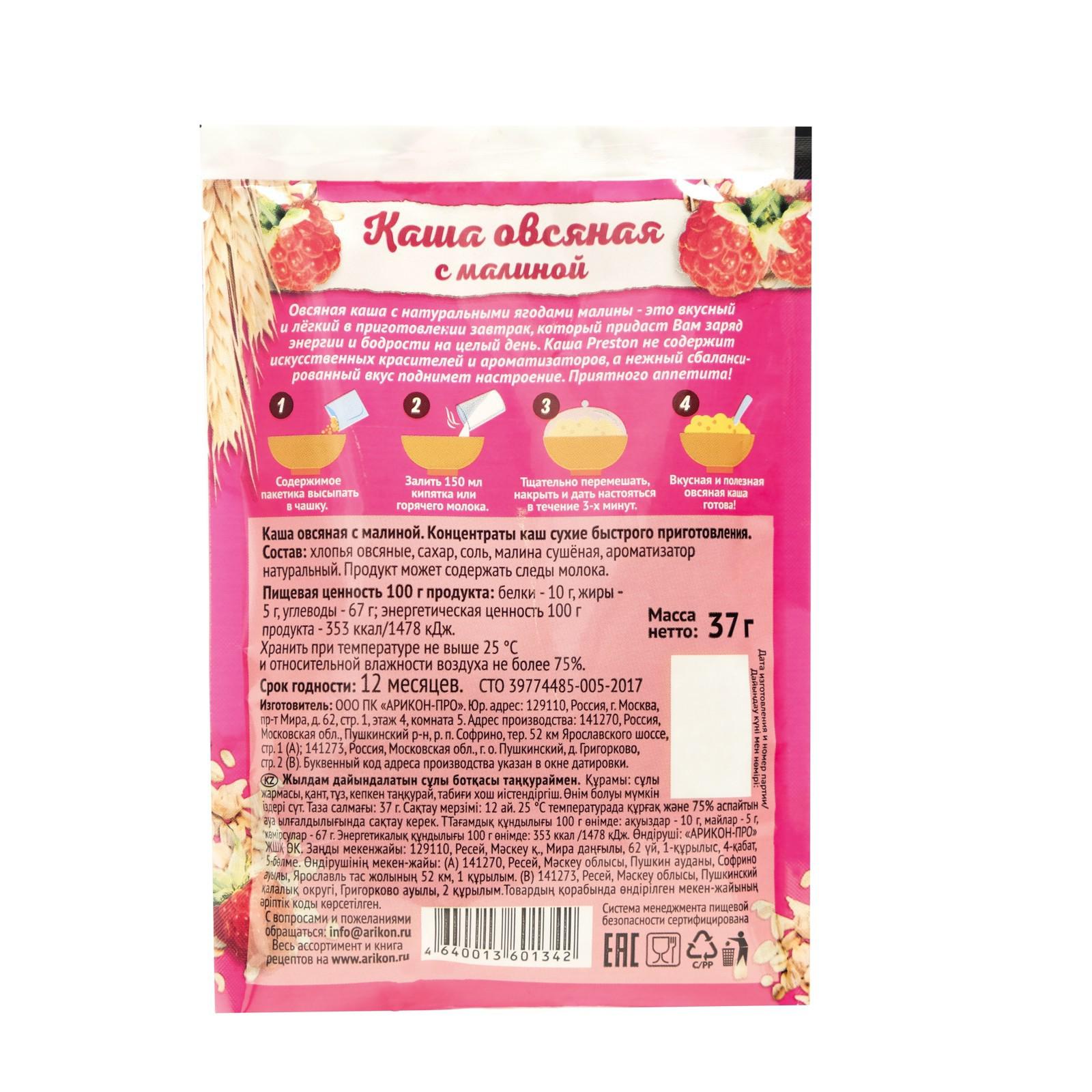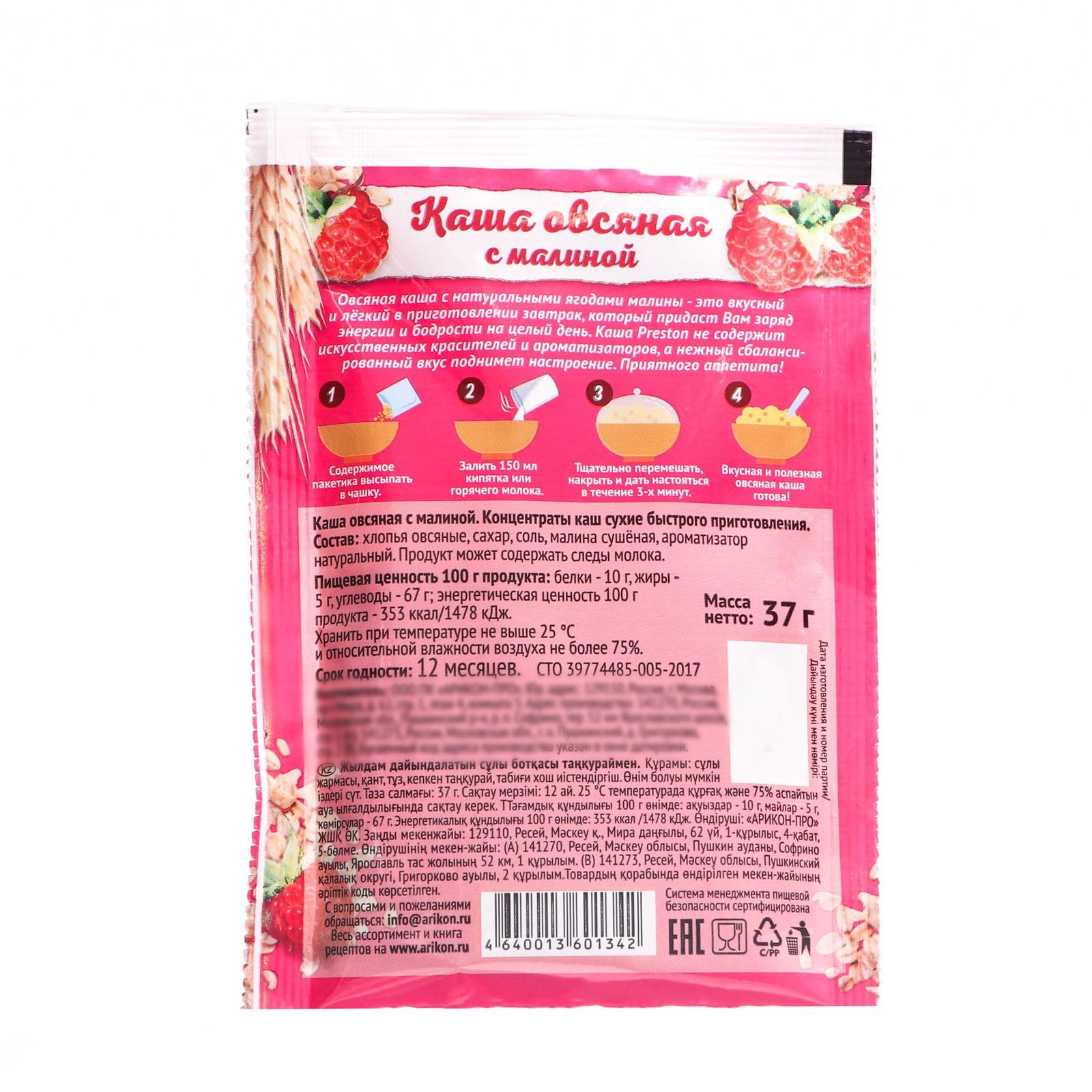 Каша овсяная с малиной Preston, быстрого приготовления, 37 г