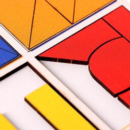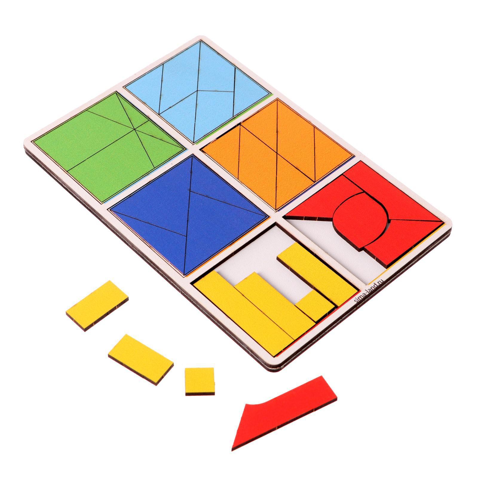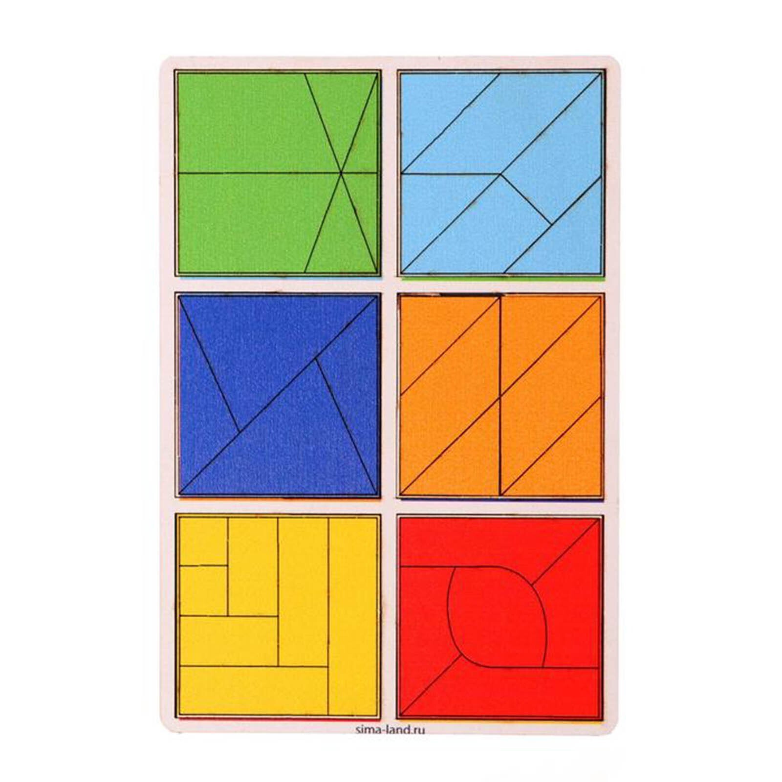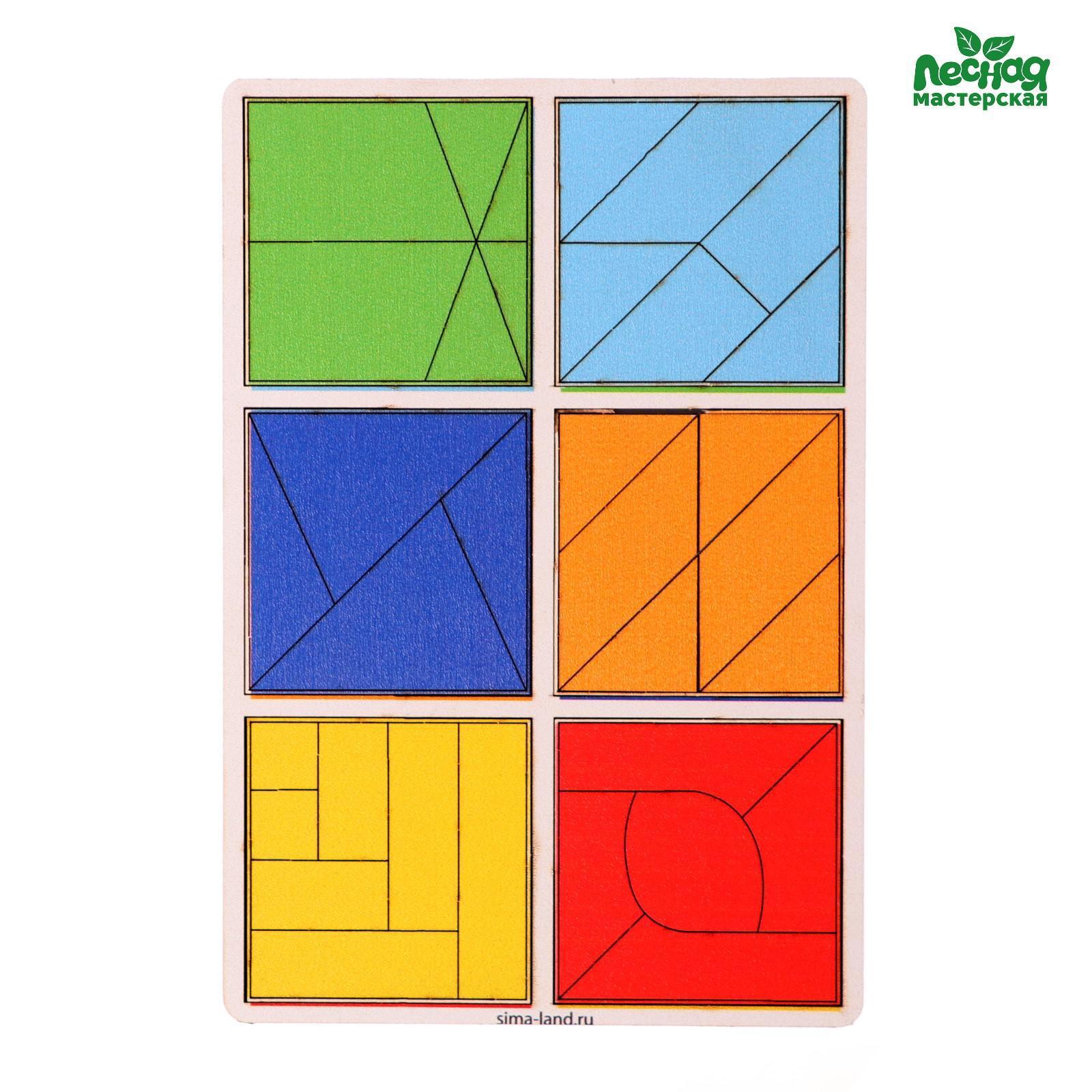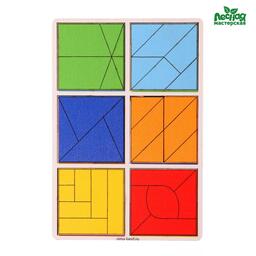 Задача малыша - собрать 6 квадратов из цветных элементов: треугольников, прямоугольников и других фигур.