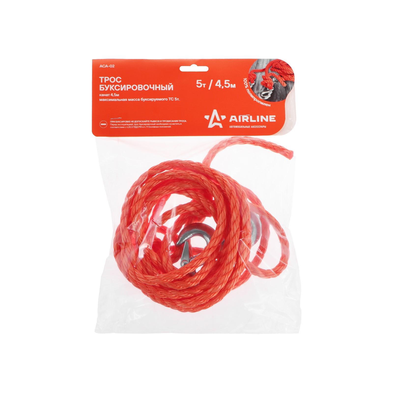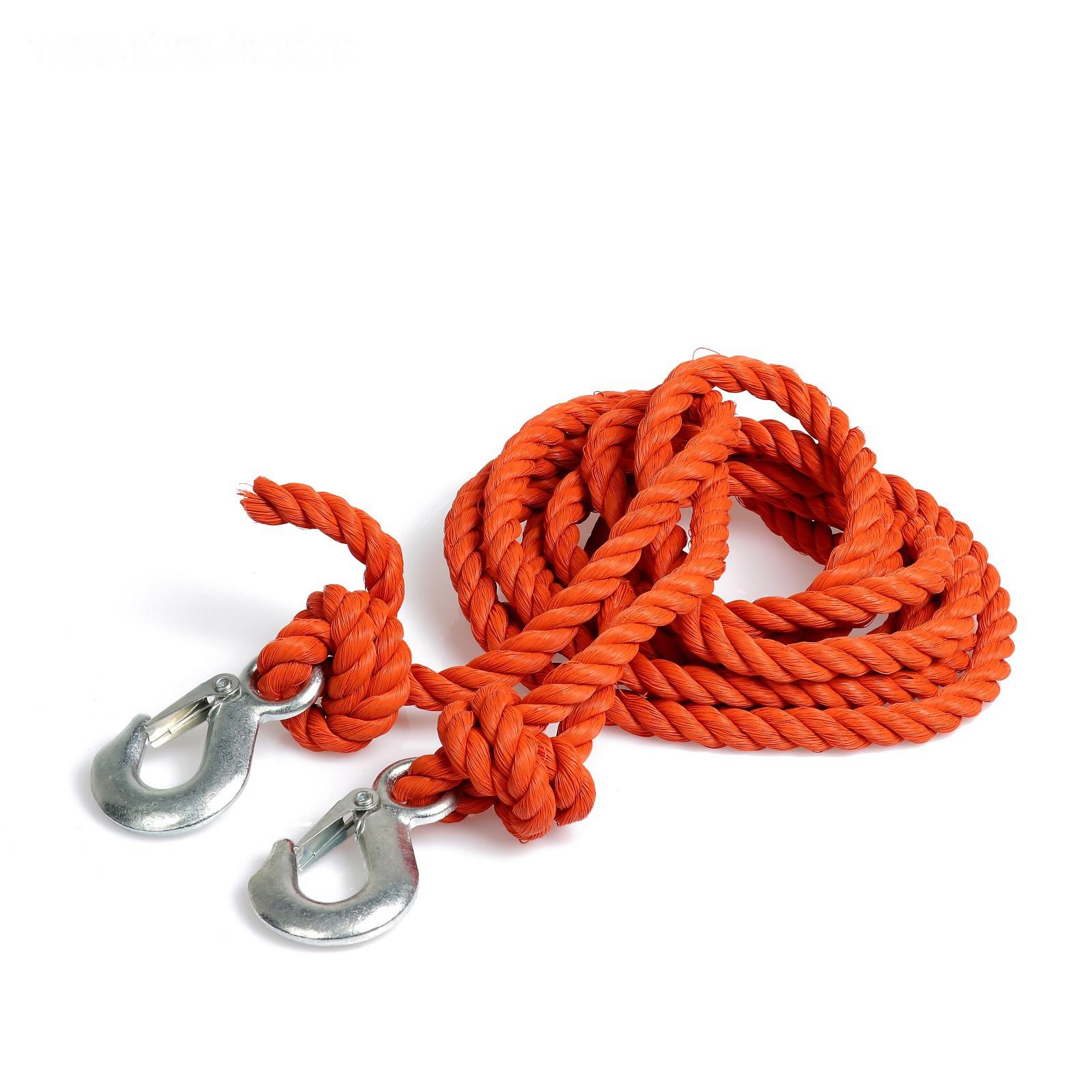 Буксировочный трос в форме каната оранжевого цвета изготовлен для транспортировки легковых машин и другой малогабаритной техники. Максимальная нагрузка на трос не должна превышать 5 тонн. Длина изделия составляет 4,5 метра. Крепление троса к автомобилю обеспечивается за счет крюков из металла.