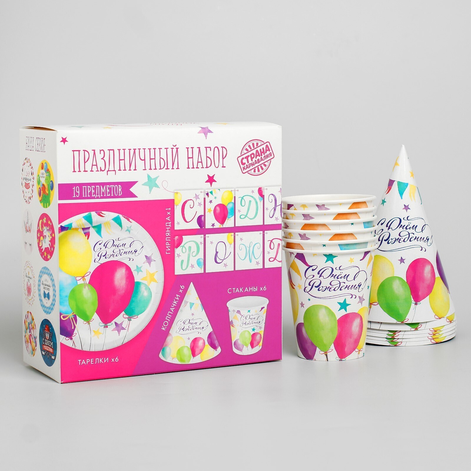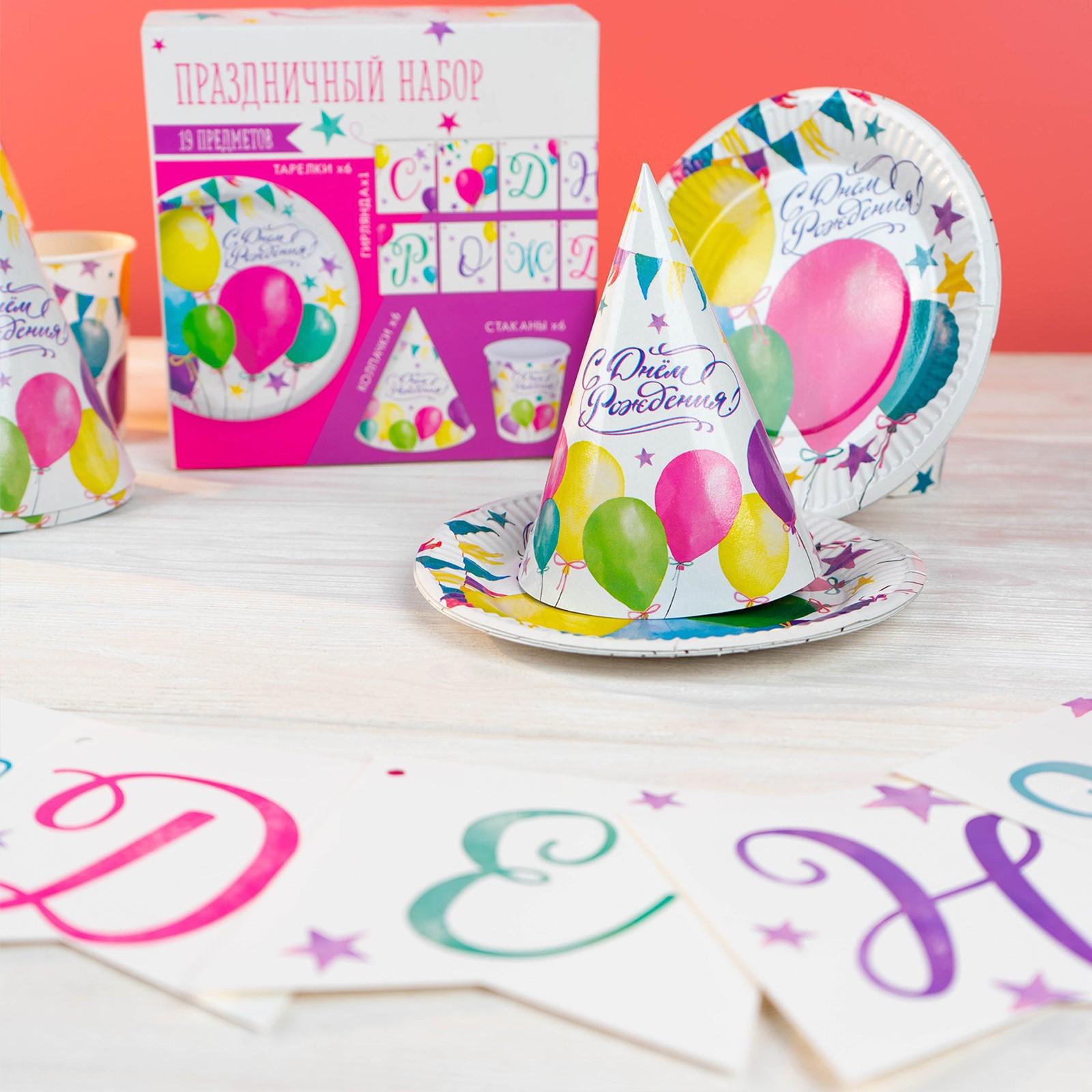 Набор бумажной посуды «С днём рождения. Шары», 6 тарелок, 6 стаканов, 6 колпаков, 1 гирлянда