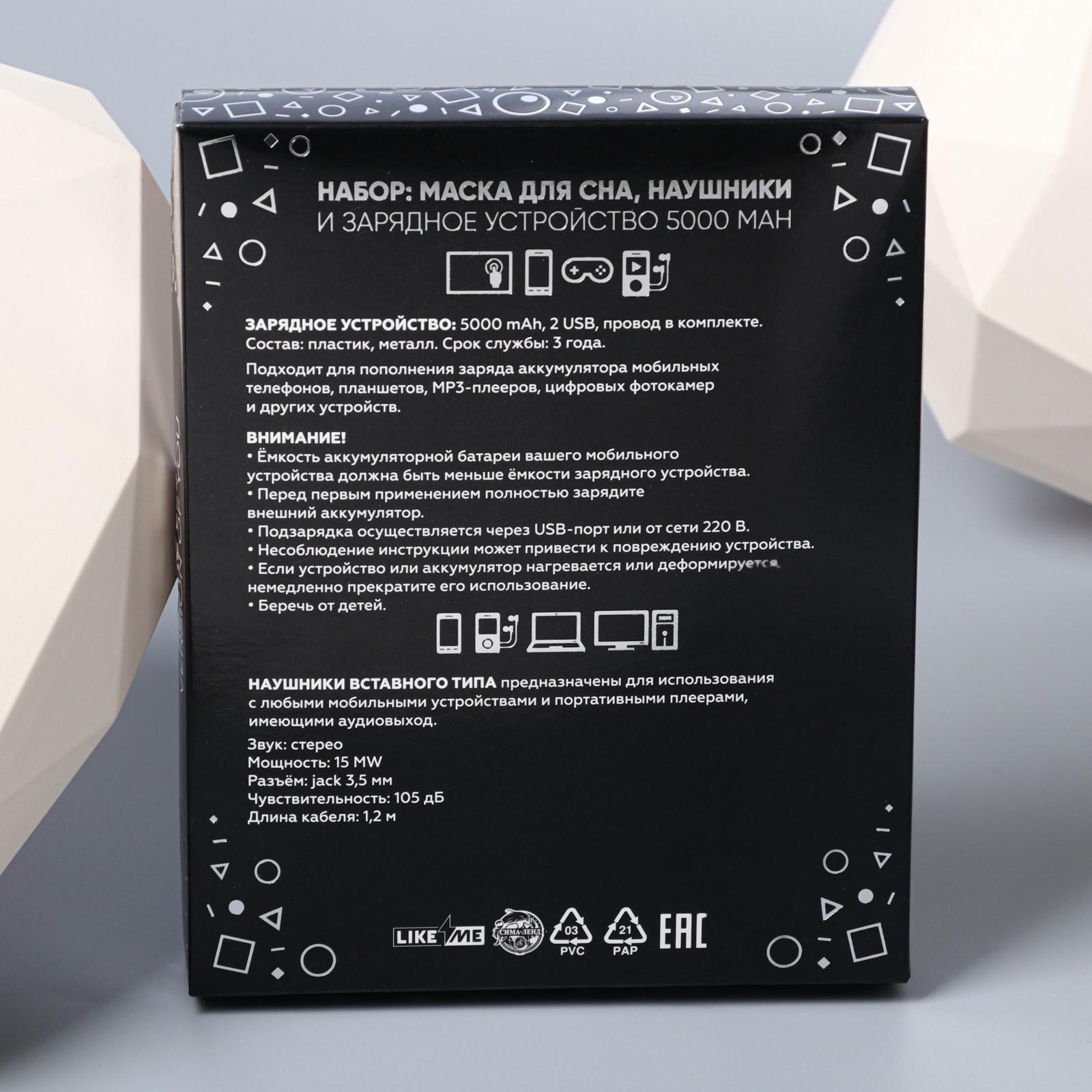 Подарочный набор с внешним аккумулятором, наушниками и маской для сна подойдет деловым людям, которые желают всегда оставаться на связи и держать всё под контролем.