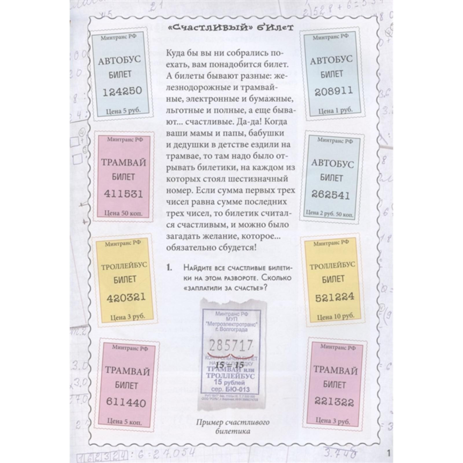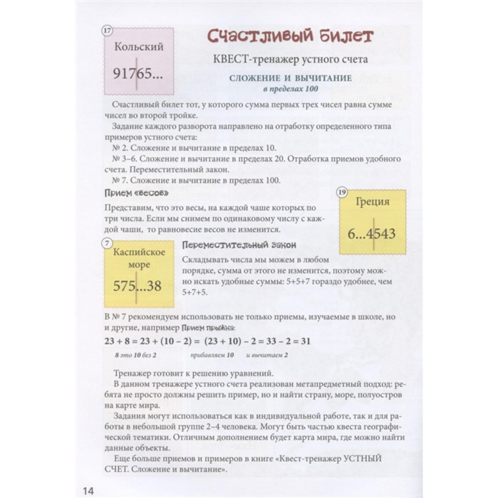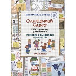 «Устный счет — гимнастика для ума». Сделать его интересным и разнообразным поможет тренажер «Счастливый билет», предназначенный для учеников 1-2 классов. Задание каждого разворота направлено на отработку определенного типа примеров устного счета: счет в пределах 10, с переходом через десяток в пределах 20 и 100. Тренажер подойдет как для индивидуальной работы, так и для коллективных квестов на уроках и занятиях математических кружков. В тренажере реализован метапредметный подход: ребята не просто должны решить пример, но и найти страну на карте мира. Рекомендуется к использованию вместе с книгой «Квест-тренажер УСТНЫЙ СЧЕТ. Сложение и вычитание», а также тетрадями для коллективных квестов.