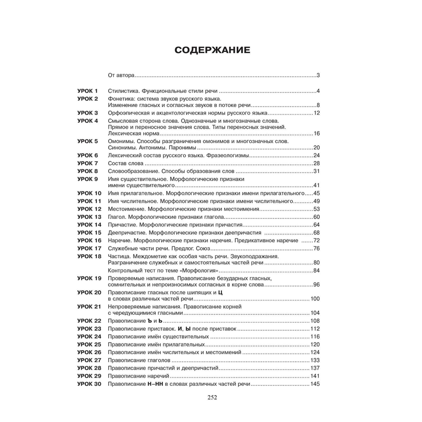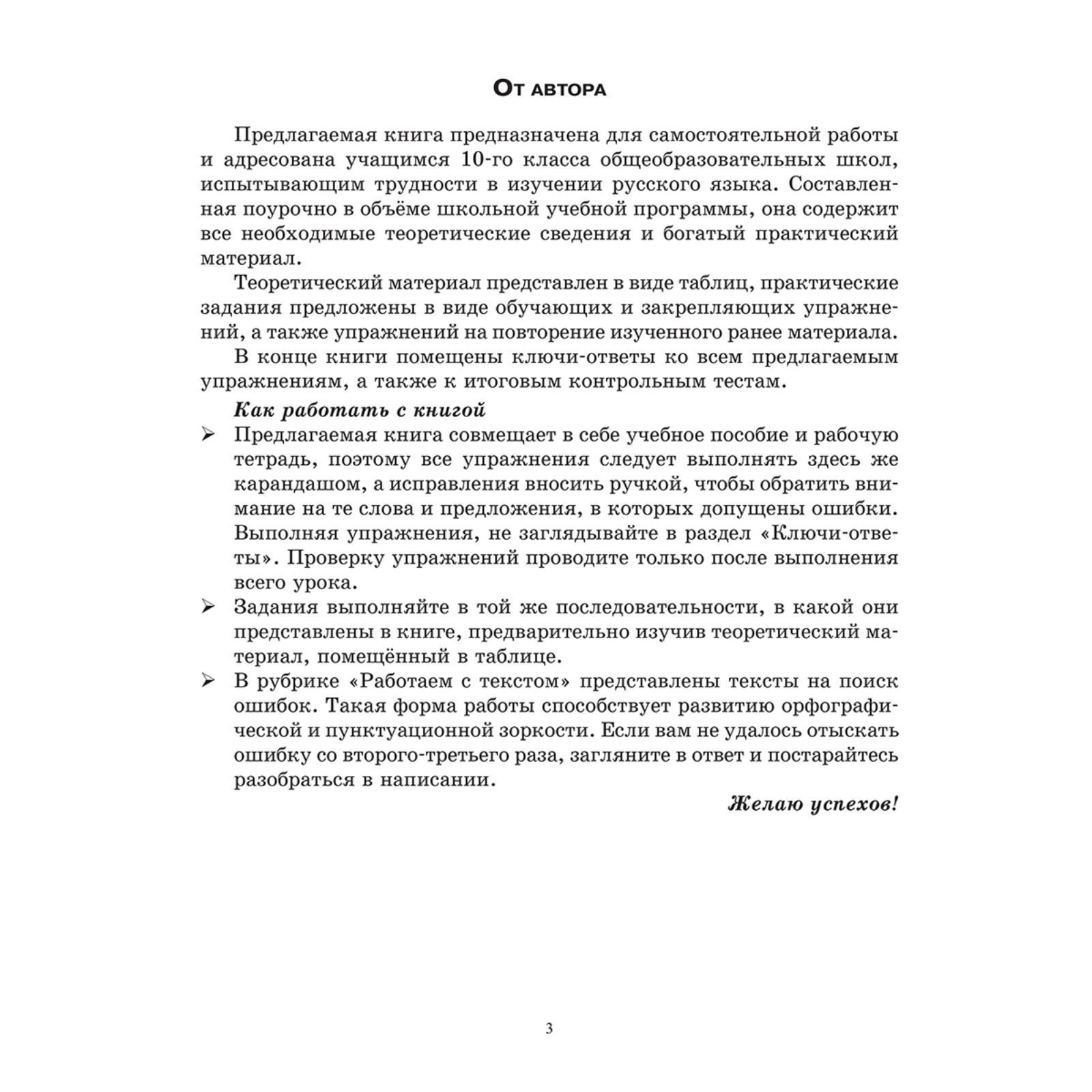 Книга адресована учащимся 10 класса, испытывающим трудности в изучении русского языка. Она составлена так, чтобы ученик мог сам легко и быстро усвоить материал школьной программы. Пособие содержит все необходимые теоретические сведения и разнообразные практические задания, что позволит отказаться от услуг репетитора и повысить грамотность самостоятельно. Издание особенно удобно тем, что совмещает в себе учебное пособие и рабочую тетрадь, поэтому все упражнения можно выполнять прямо в книге. Здесь же приводятся ключи-ответы ко всем упражнениям и тестам. Новая редакция пособия содержит существенные улучшения и дополнения.