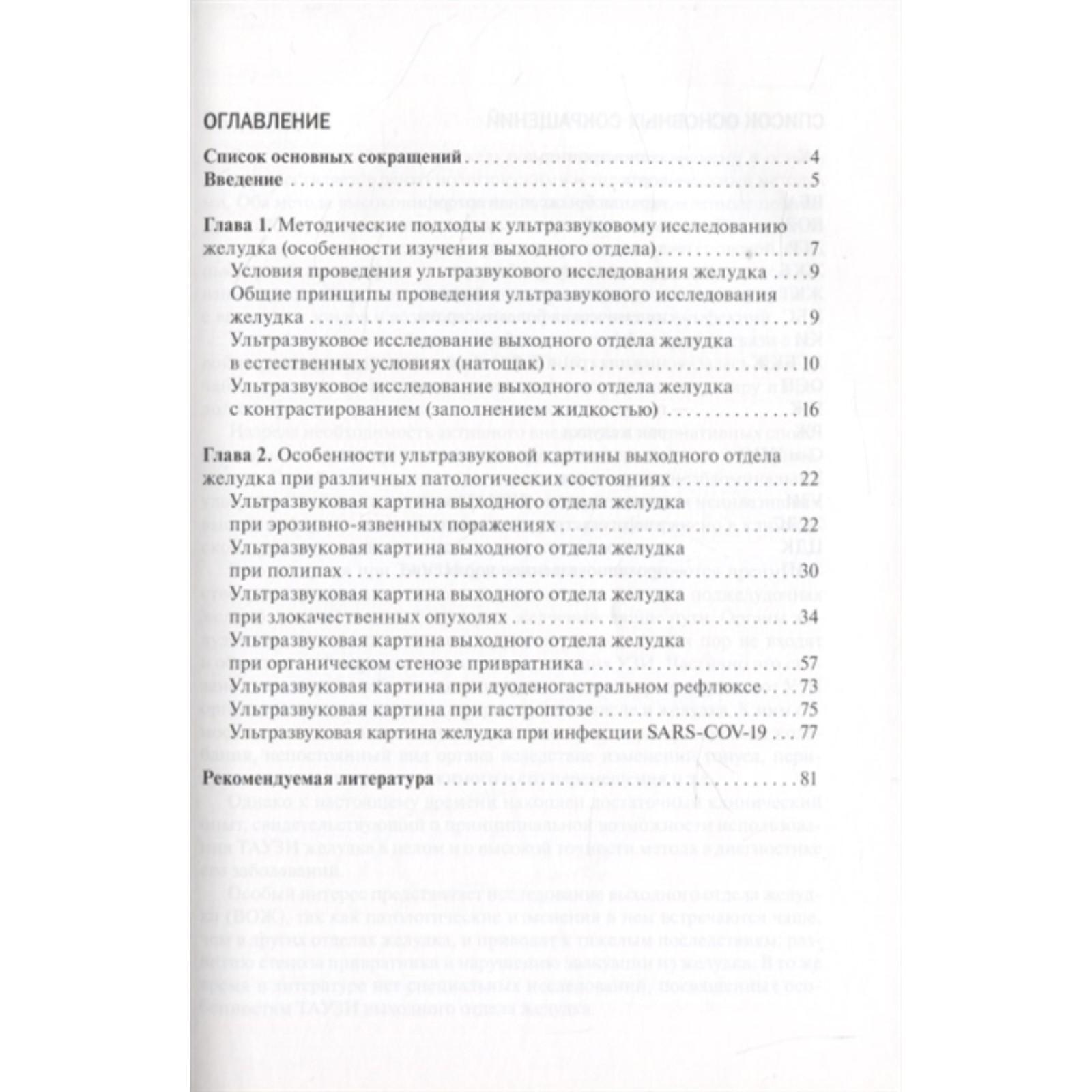 В руководстве обобщены современные представления об ультразвуковом исследовании желудка на основании данных литературы и собственного клинического опыта авторов. Подробно изложена методика исследования выходного отдела желудка, в котором патологические изменения встречаются чаще, чем в других отделах, и могут приводить к тяжелым осложнениям, формированию стеноза привратника и задержке эвакуации желудочного содержимого. В руководстве также описаны оригинальные методики исследования желудка при проведении чрескожного ультра звукового исследования брюшной полости, отмечены особенности ультразвукового изображения выходного отдела желудка у здоровых людей и обоснована целесообразность использования данного метода для диагностики заболеваний желудка. На основании собственных данных уточнена ультразвуковая семиотика наиболее часто встречаемых заболеваний выходного отдела желудка: эрозивно-язвенных поражений, доброкачественных и злокачественных опухолей, органического стеноза привратника; определены ультразвуковые критерии гастроптоза, дуоденогастрального рефлюкса. Во 2-м издании также описаны изменения желудка при новой коронавирусной инфекции COVID-19. Последнее особенно актуально, так как исследование желудка с помощью обычных рентегнологического и эндоскопического методов при наличии инфекции COVID-19 ограничено в связи с эпидемической обстановкой и тяжелым состоянием пациентов. Издание предназначено специалистам по ультразвуковой диагностике, гастроэнтерологам, рентгенологам, эндоскопистам, терапевтам, врачам общей практики и другим специалистам.