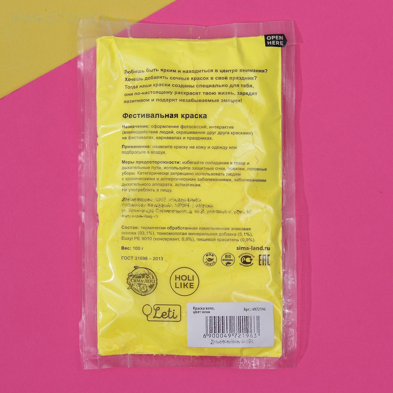 Краски Холи растительного происхождения: в состав входит крахмал или кукурузная мука с добавлением пищевых красителей. Они абсолютно безопасны для здоровья.