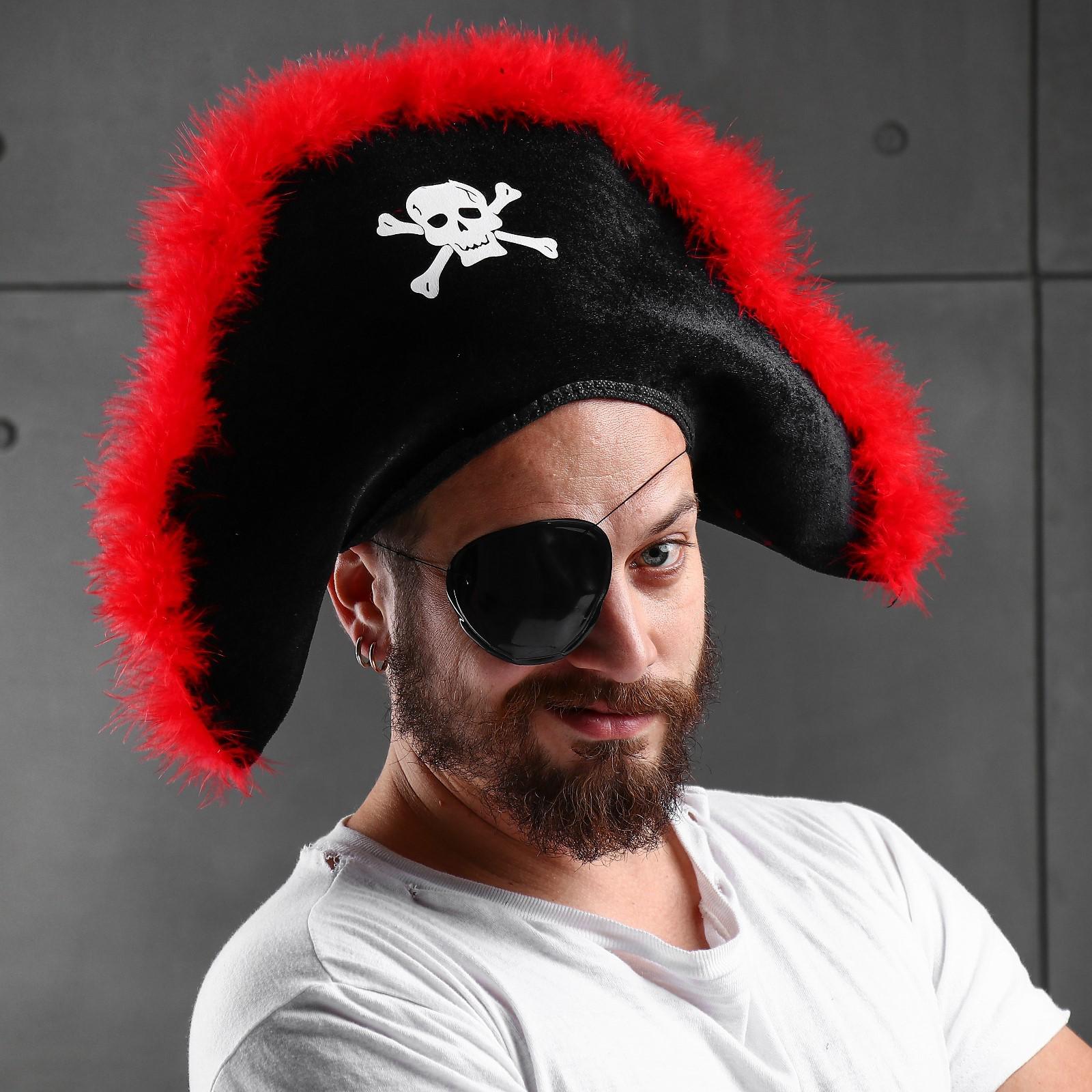 Карнавальная шляпа «Пиратка», с красным пухом, р-р. 56-58 отличное дополнение к вашему образу. Мы предлагаем для вас множество вариантов, как эффектно появиться на вечеринке в образе пирата. Кинжал, костюм, бандана, попугай на плече и бутылка рома в руках – вот составляющие образа морского разбойника. Но все же шляпа остается важной деталью в образе.