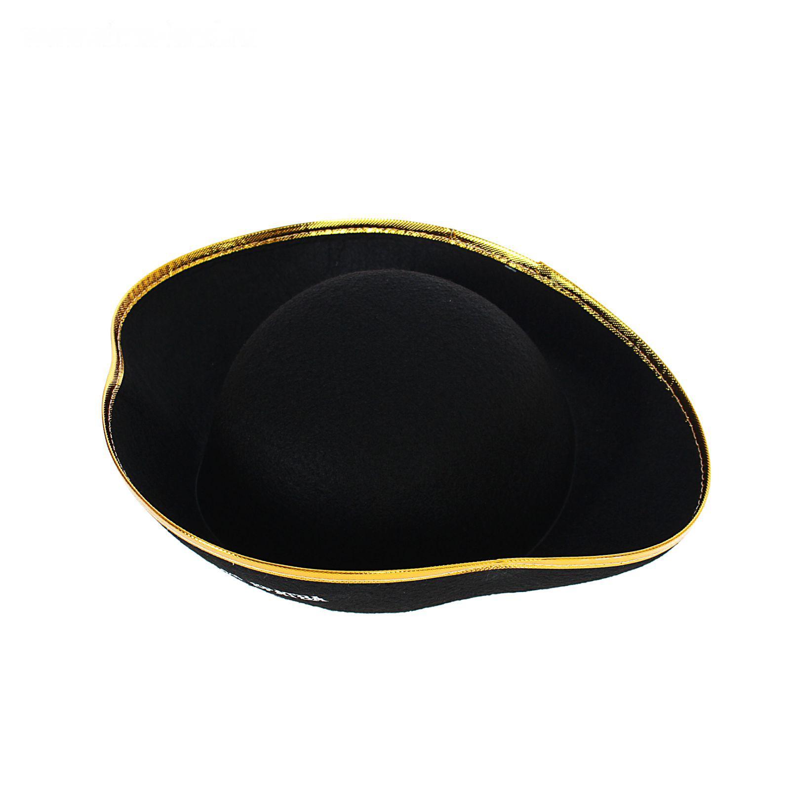 Шляпа пиратская, детская, золотистая каемка, р-р. 50 отличное дополнение к вашему образу. Мы предлагаем для вас множество вариантов, как эффектно появиться на вечеринке в образе пирата. Кинжал, костюм, бандана, попугай на плече и бутылка рома в руках – вот составляющие образа морского разбойника. Но все же шляпа остается важной деталью в образе.