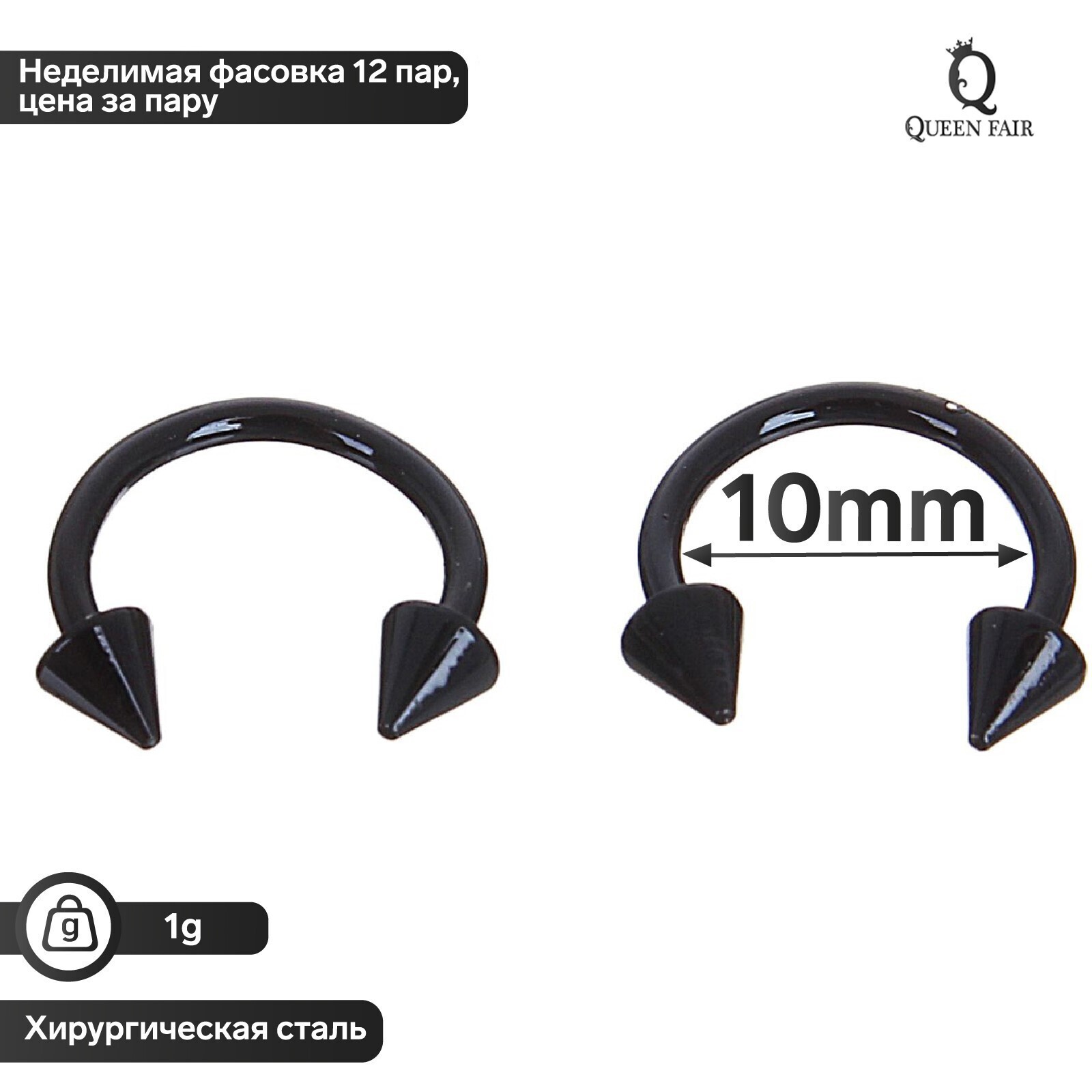 Циркуляр в бровь (пирсинг), шип, d= 10мм, пара, цвет чёрный (неделимая фас.12пар, цена за пару)
