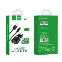 Сетевое зарядное устройство Hoco C12, 2 USB - 2.4 А, кабель Lightning 1 м, черный