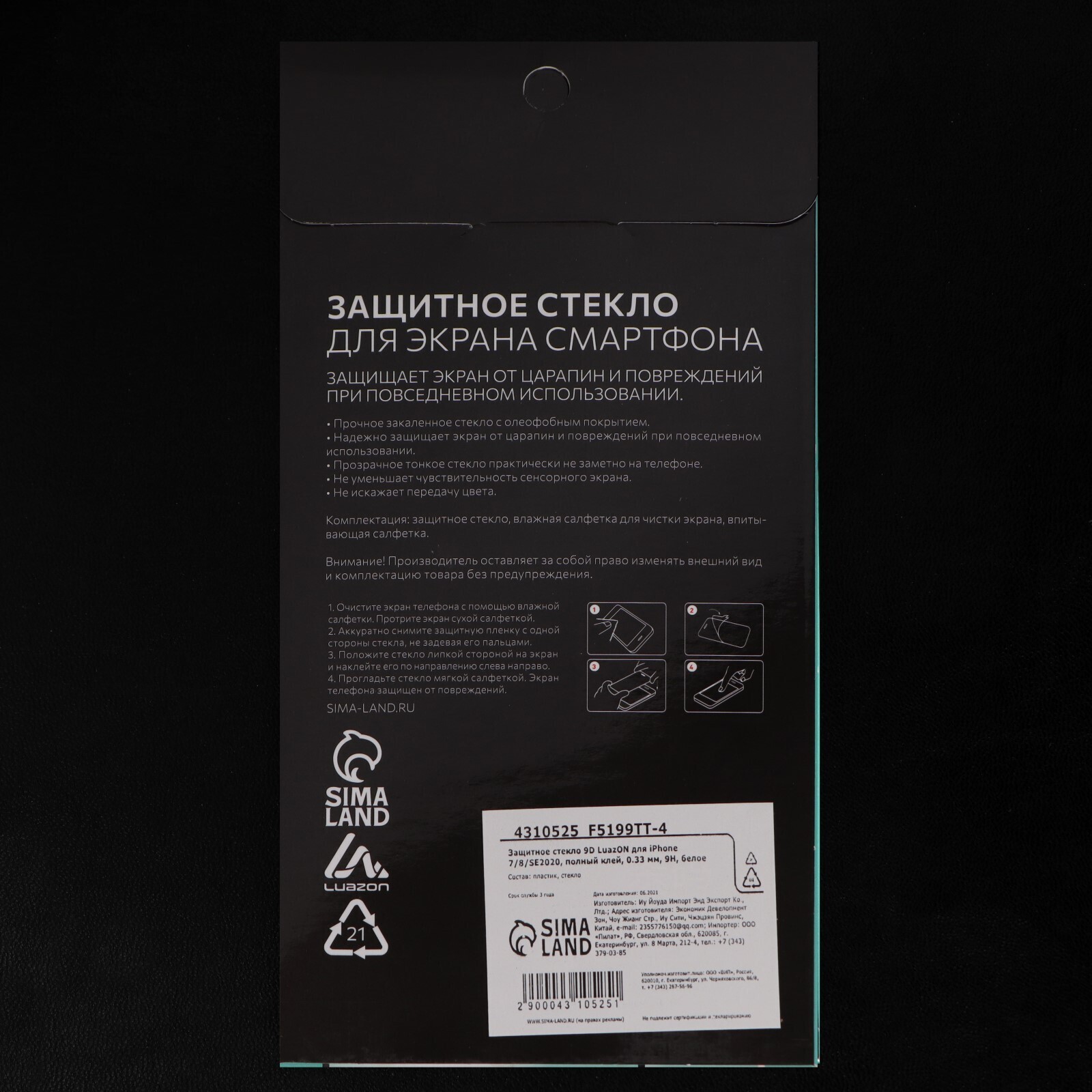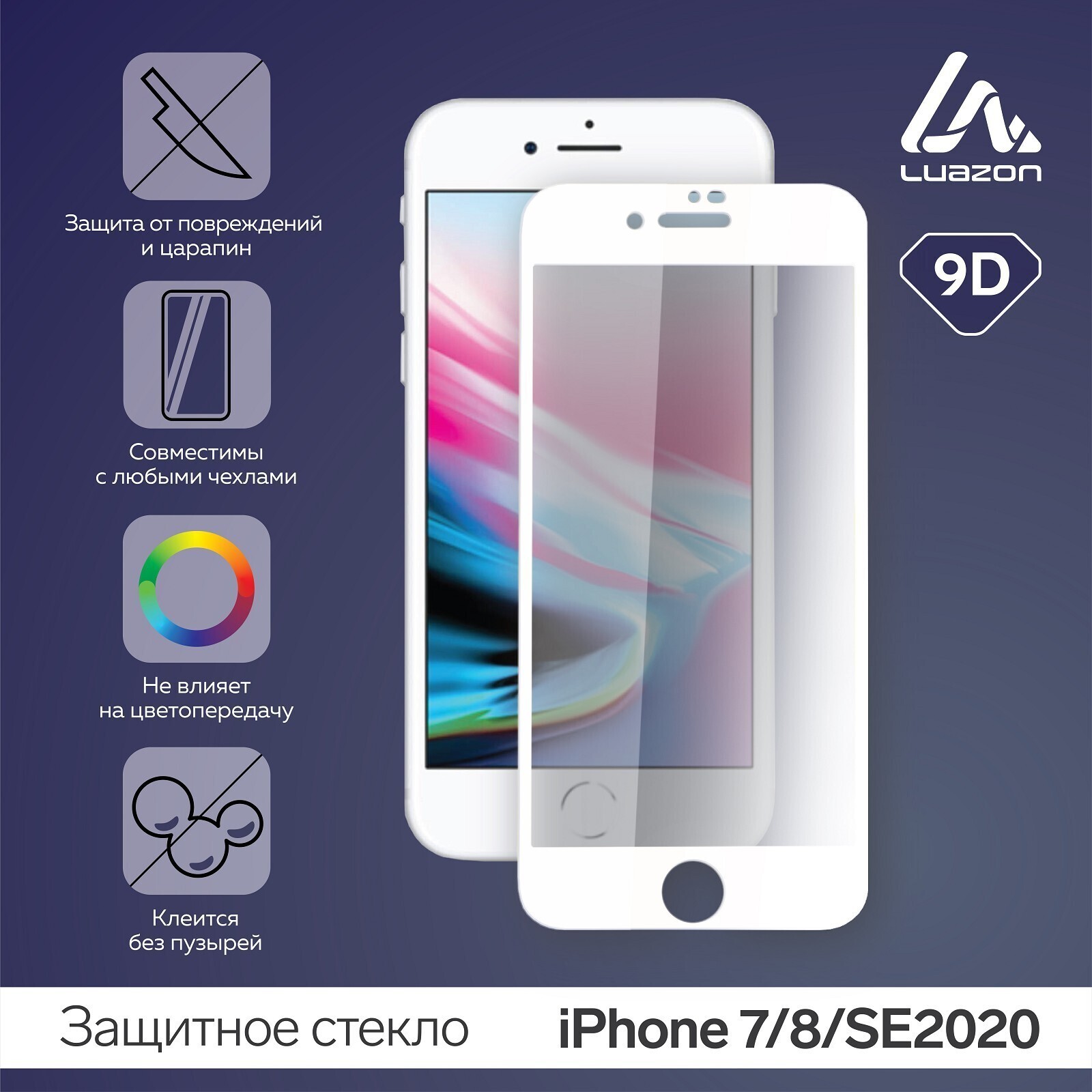 Защитное стекло 9D LuazON для iPhone 7/8/SE2020, полный клей, 0.33 мм, 9Н, белое