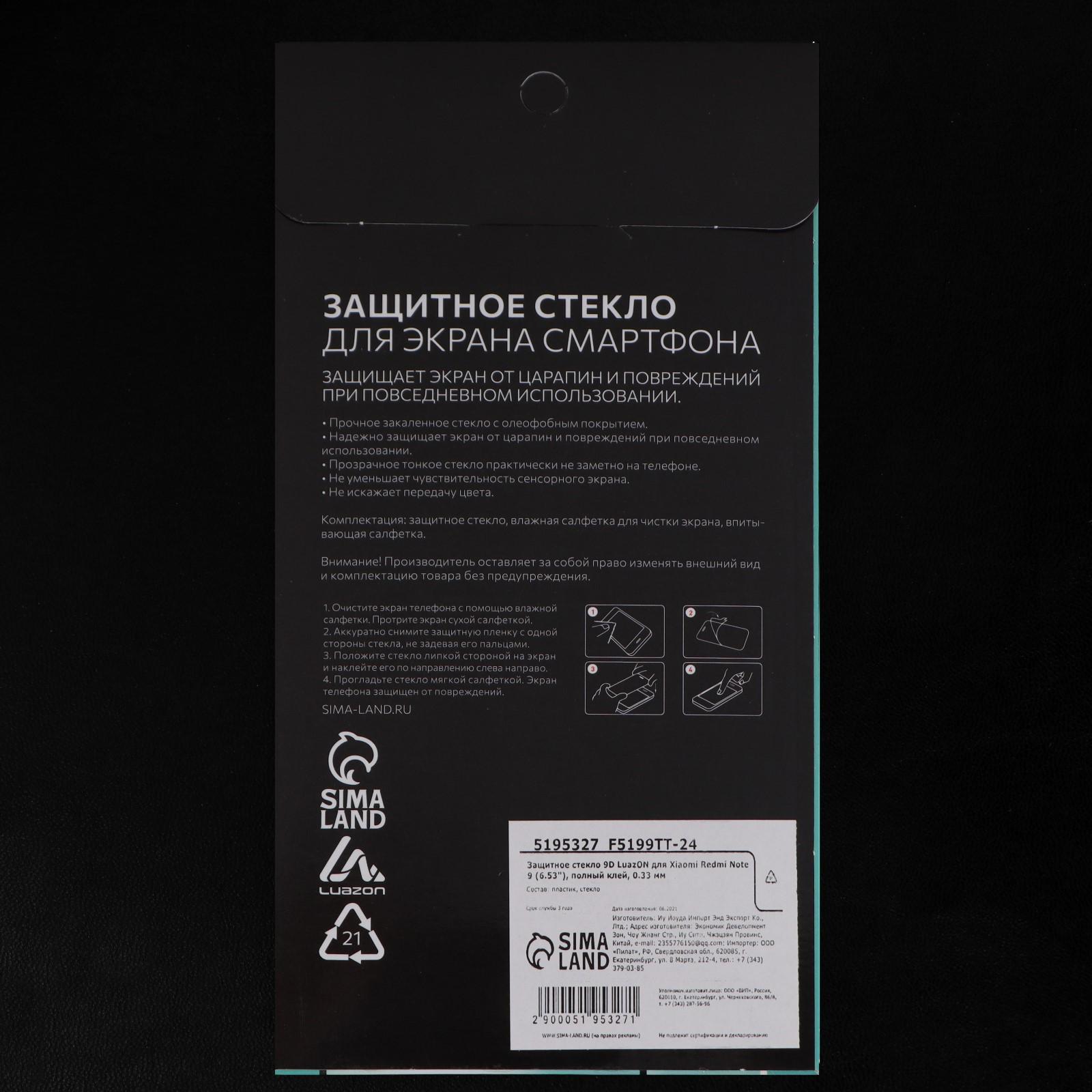 Защитное стекло 9D LuazON для Xiaomi Redmi Note 9 (6.53"), полный клей, 0.33 мм