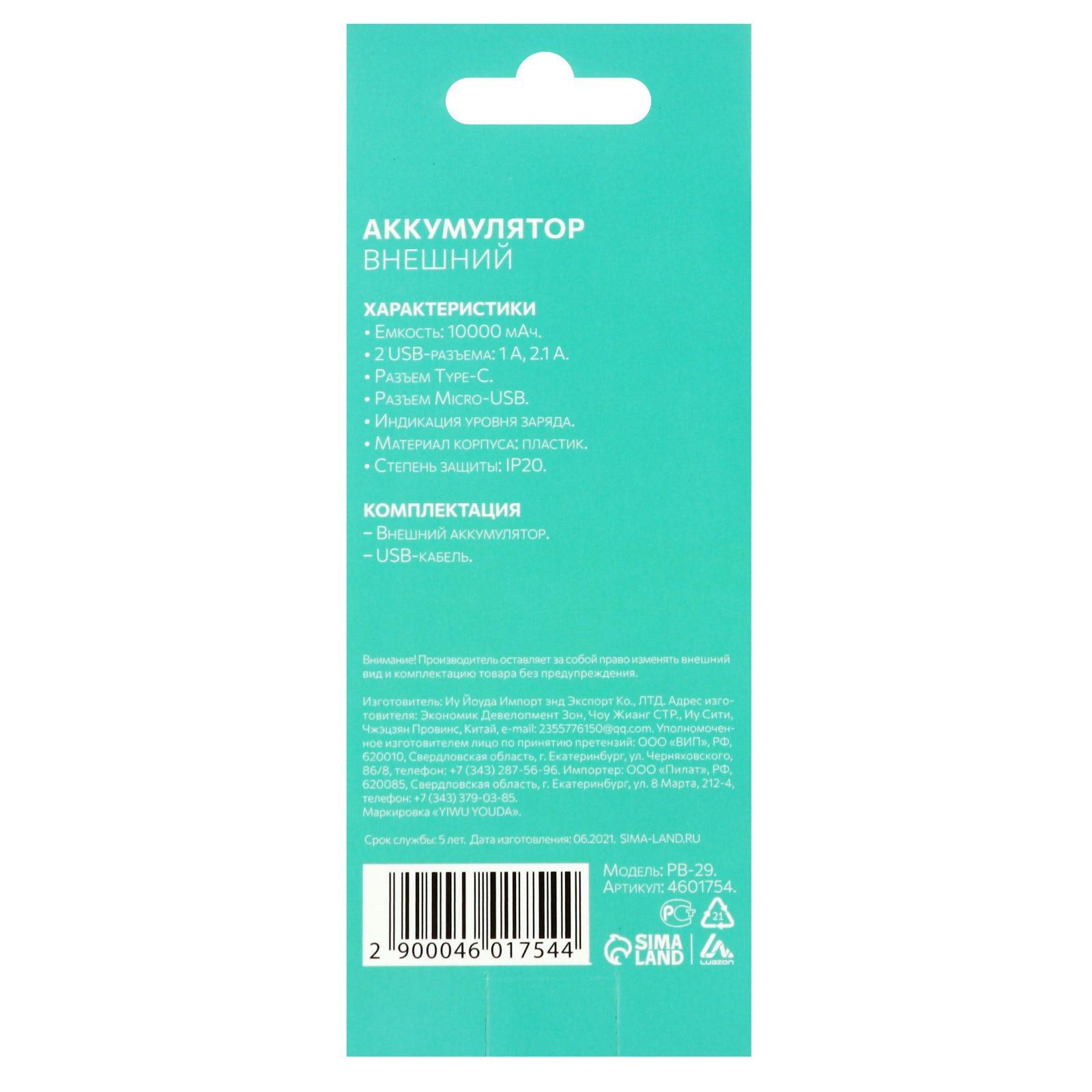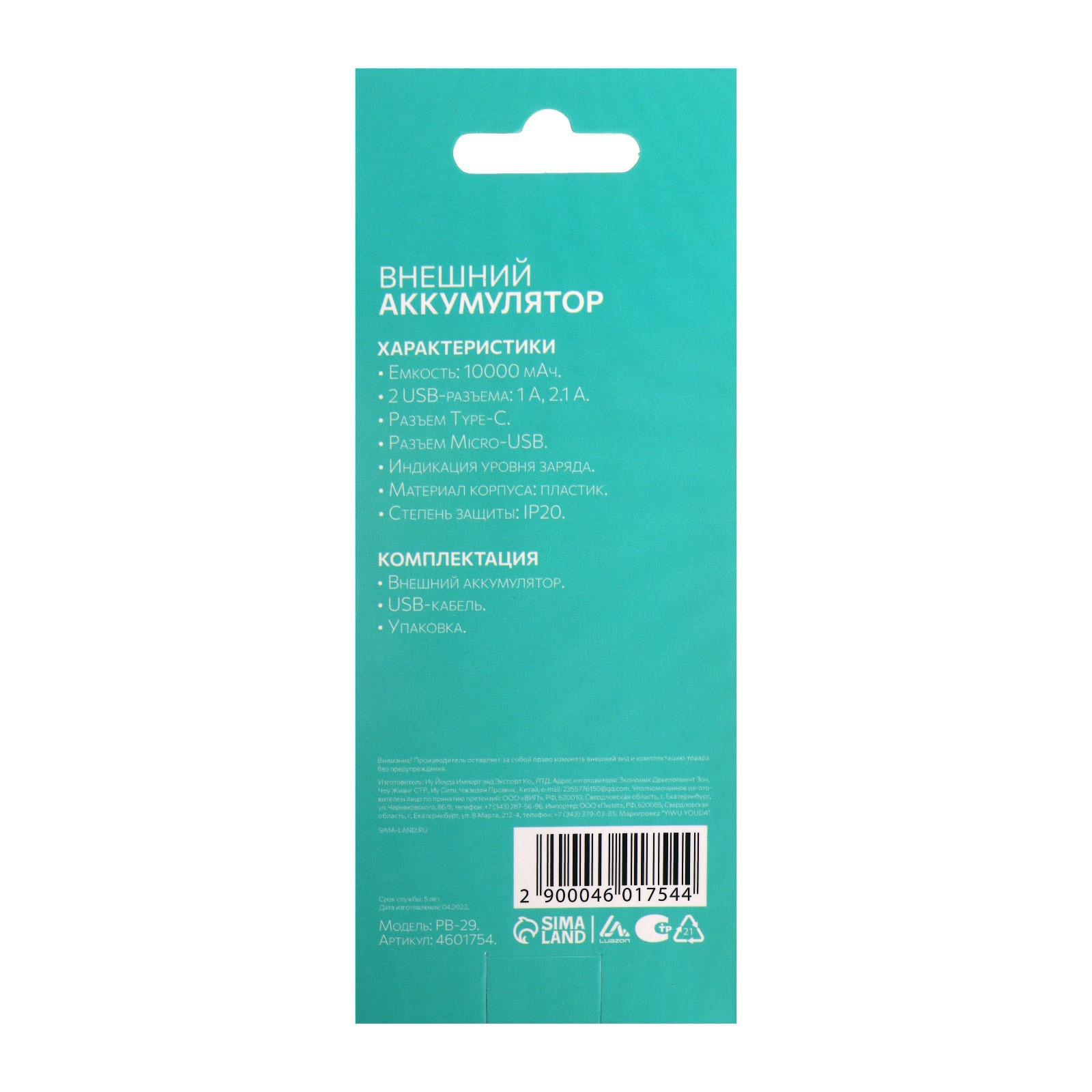 Внешний аккумулятор LuazON PB-29, Li-Pol, 10000 мАч, 2 USB, Type-C, microUSB, 2.1 A/1 A