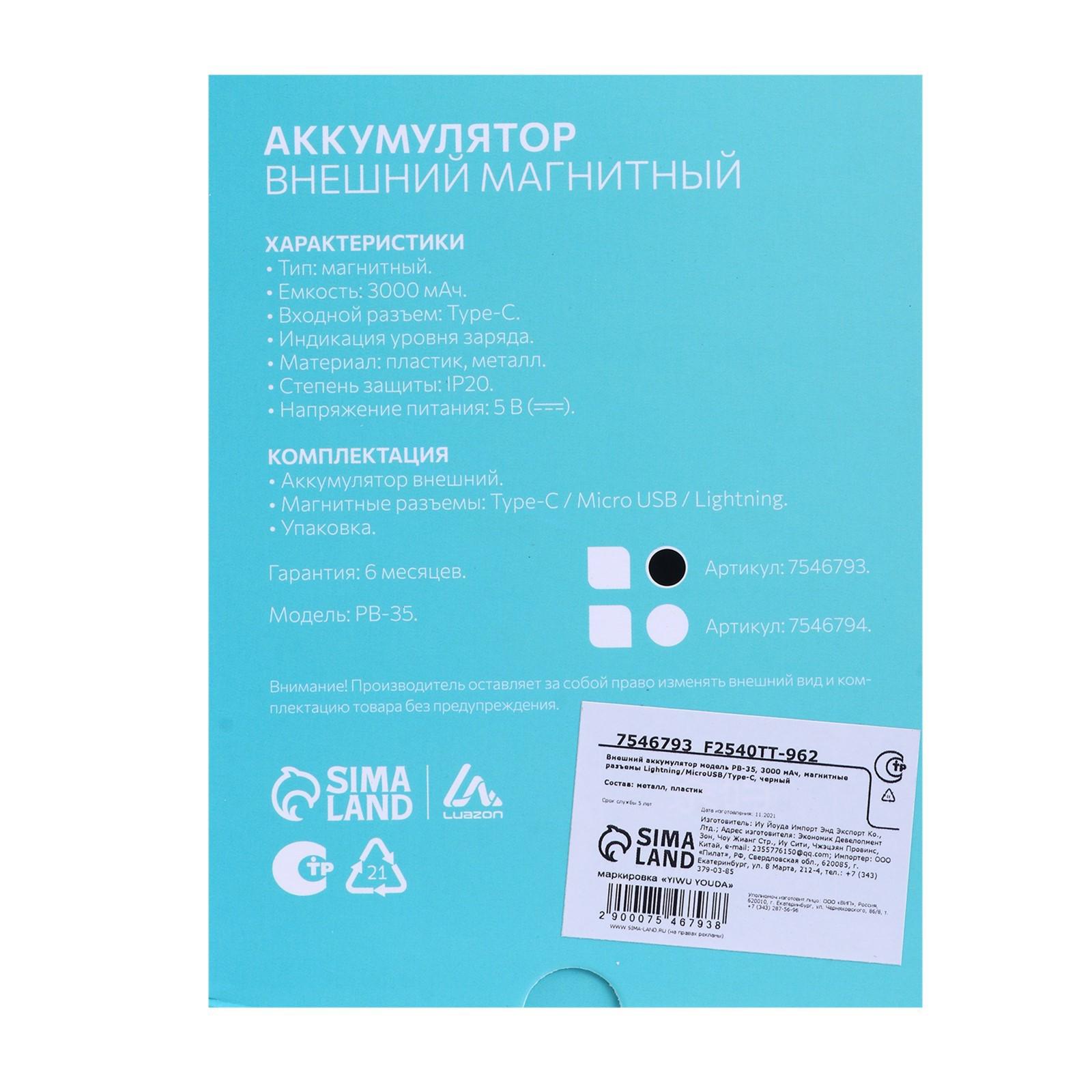 Внешний аккумулятор PB-35, 3000 мАч, магнитные разъемы Lightning/MicroUSB/Type-C, черный