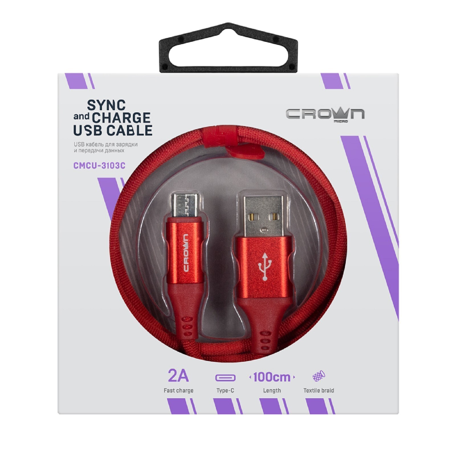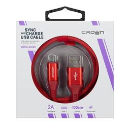 Кабель Crown CMCU-3103С, Type-C - USB, 2А, 1м, тканевая оплетка, металл, красный