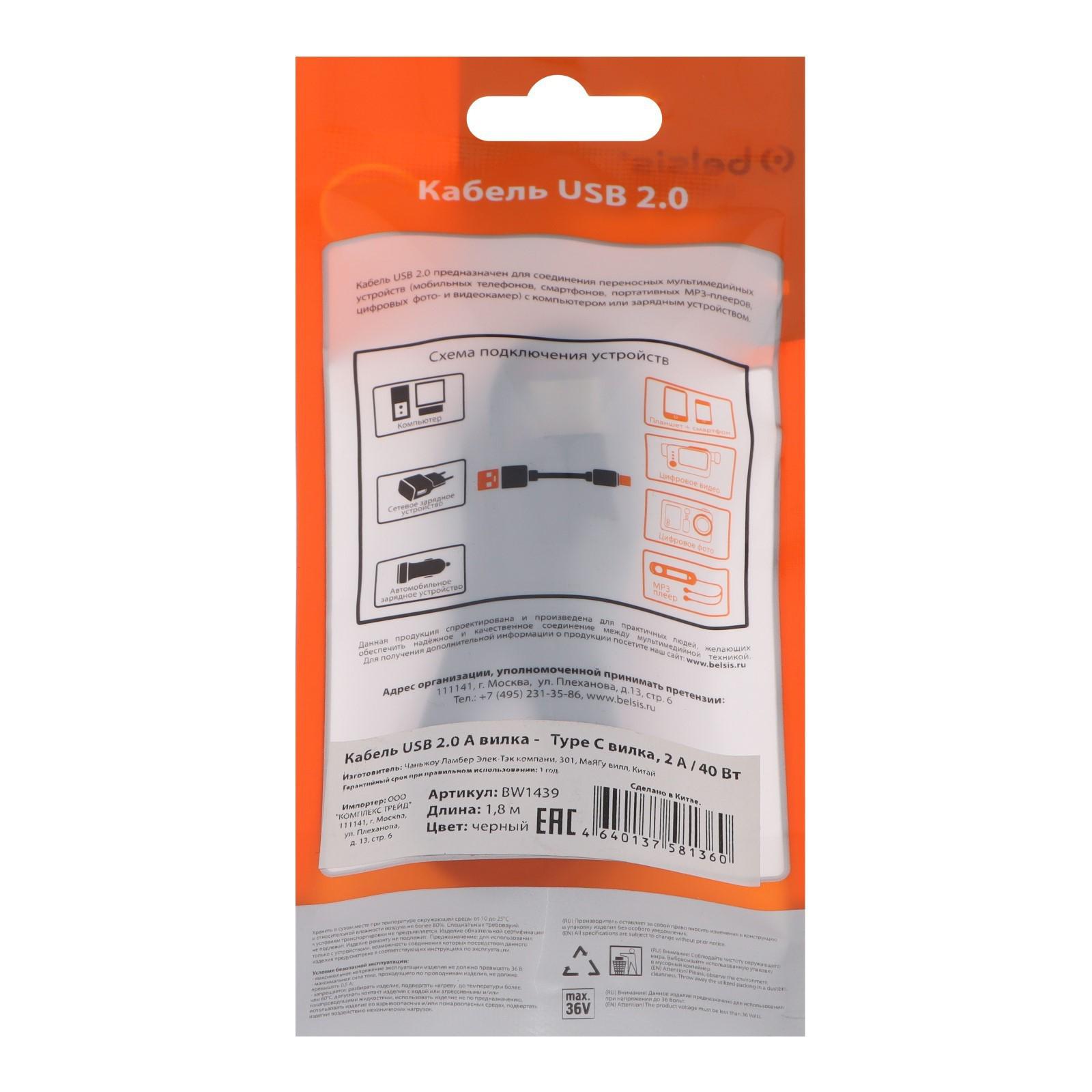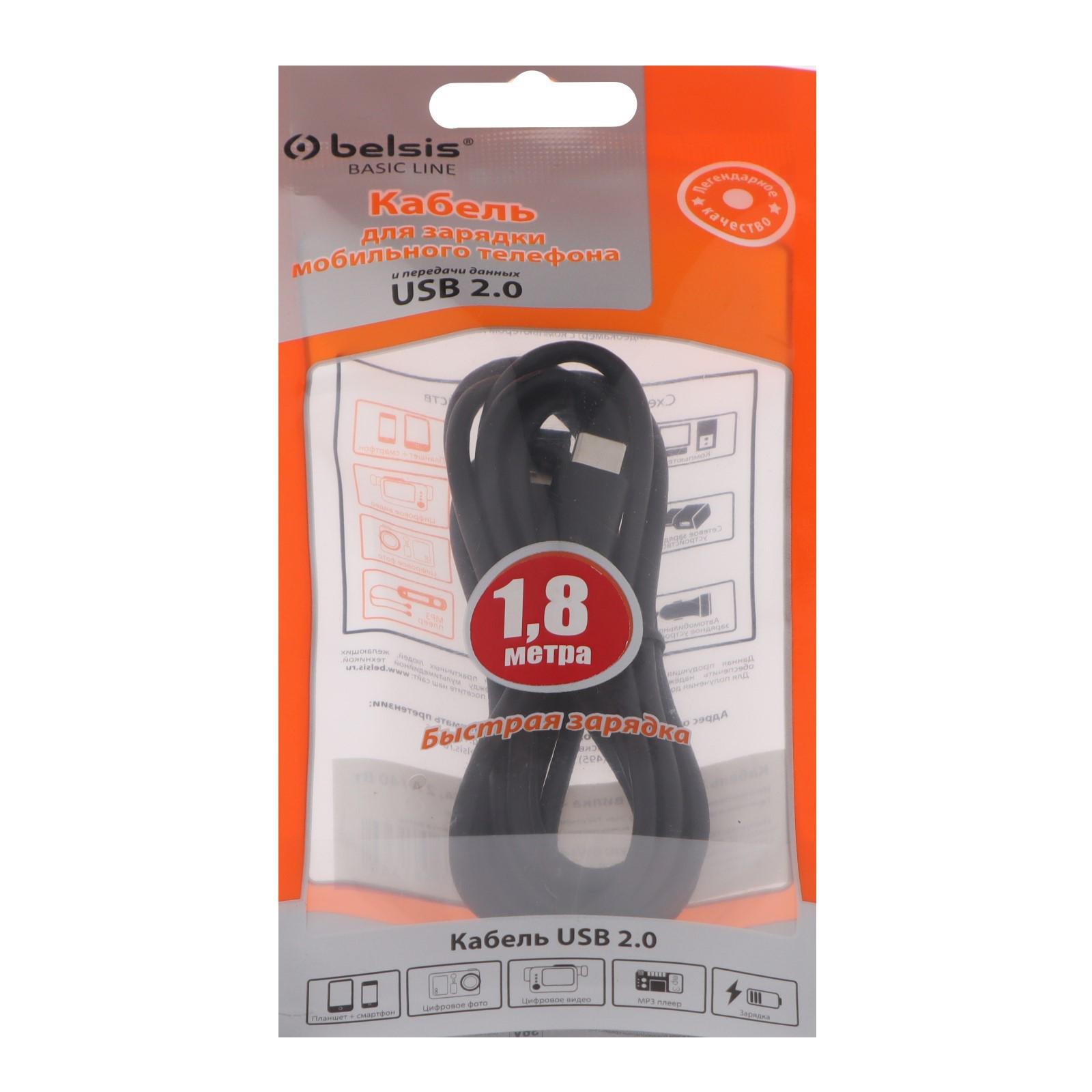 Кабель Belsis BW1439, Type-C - USB, 2 А, 1.8 м, быстрая зарядка, передача данных, черный