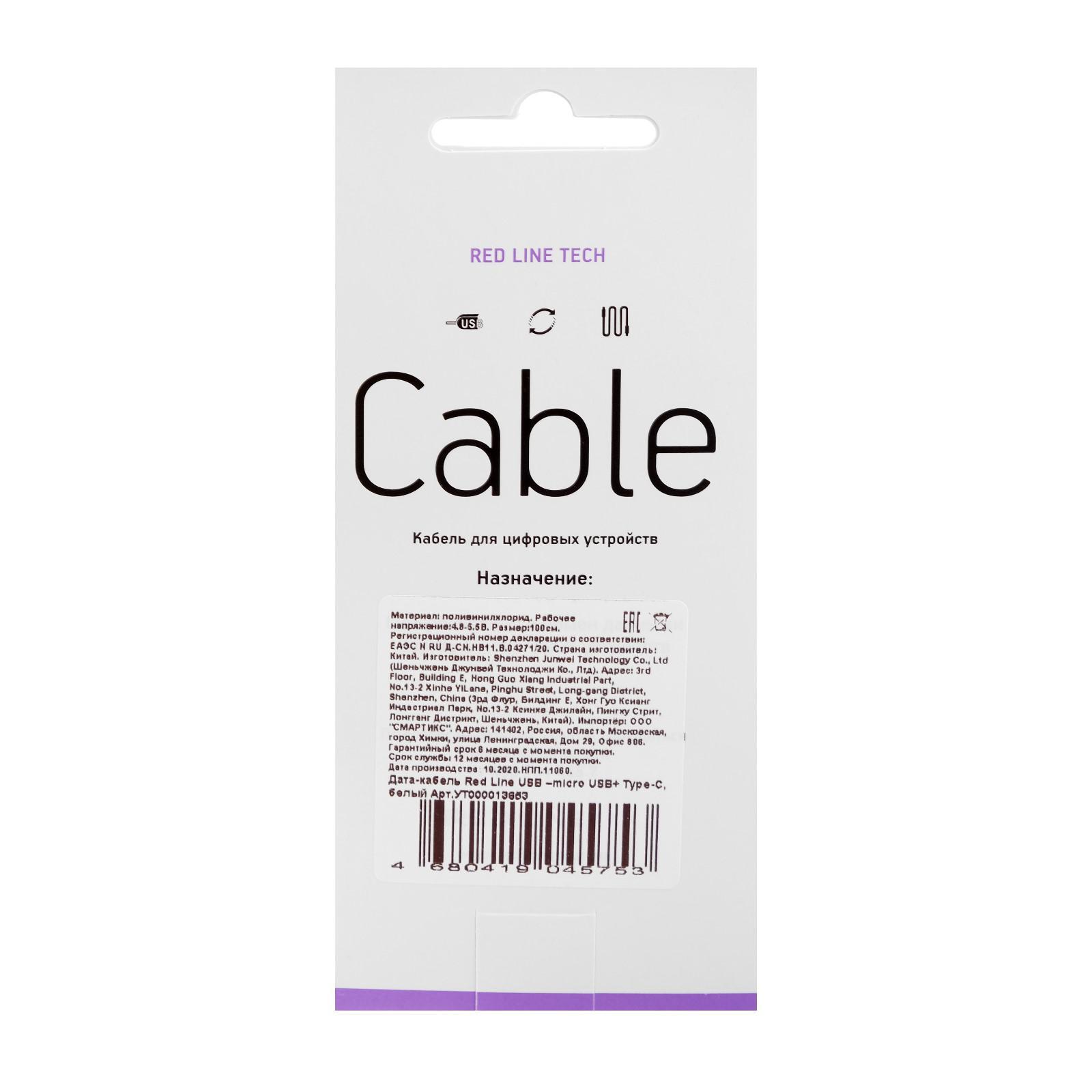Кабель Red Line, Micro USB+Type-C - USB, 2 А, 1 м, белый