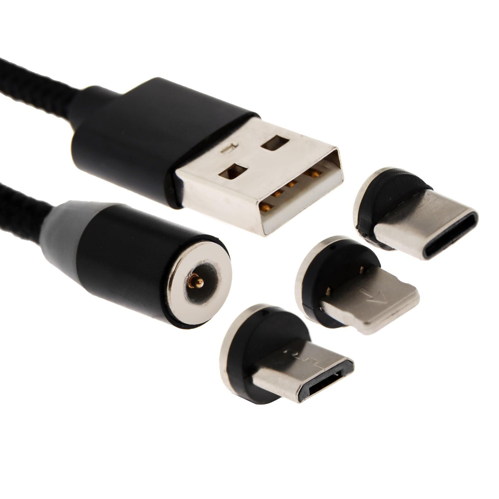 Кабель Windigo, 3 в 1, microUSB/Lightning/Type-C - USB, магнитный, 2 А, нейлон, 1 м, черный