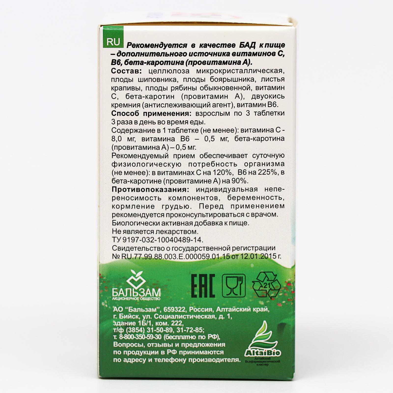 Состав: МКЦ, шиповник, боярышник, рябина обыкновенная, крапива, витамин С, витамин В6, бета-каротин.