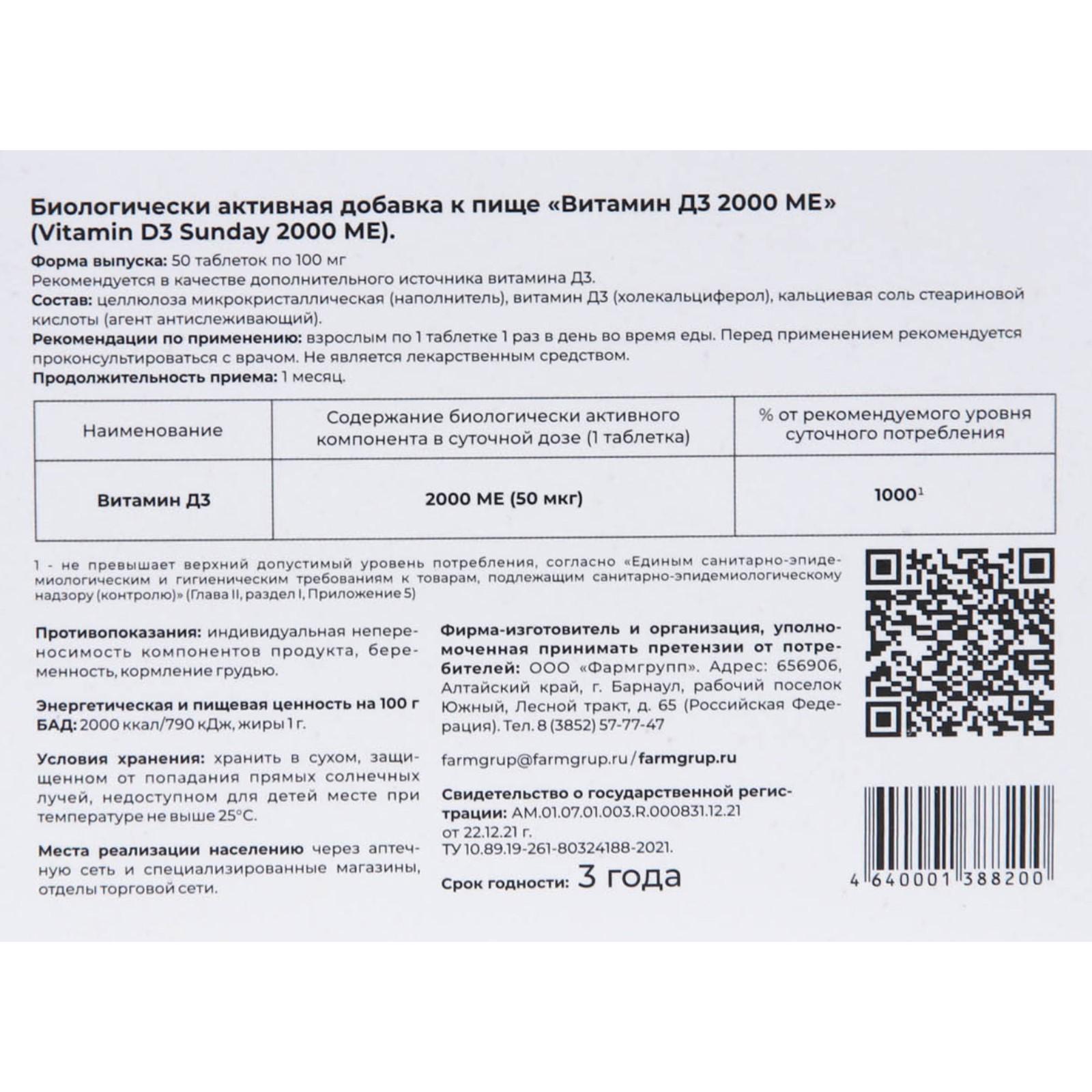 Витамин D3, 2000 ME, 50 таблеток по 100 мг