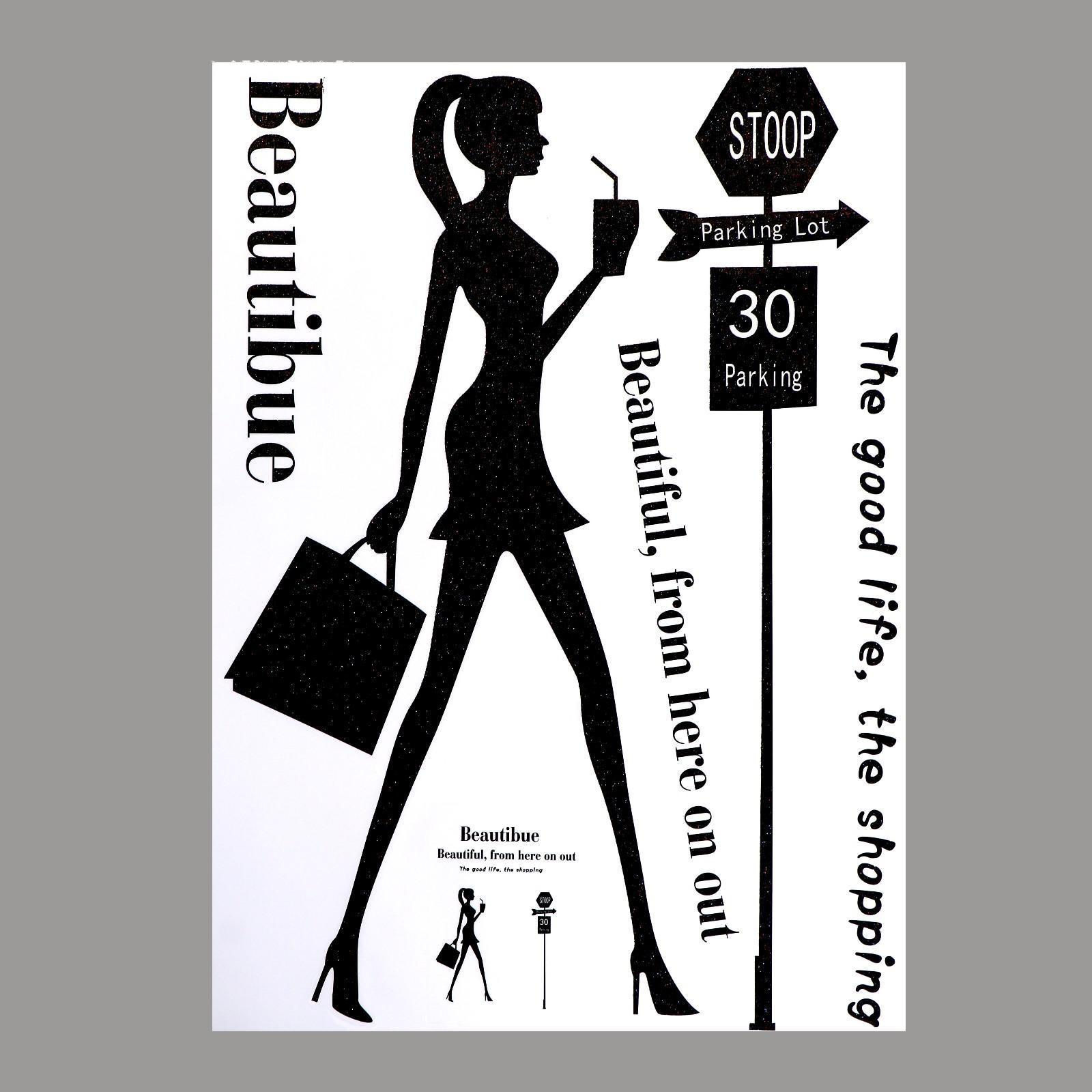 Наклейка пластик интерьерная чёрная "Девушка с покупками" блёстки 50х70 см