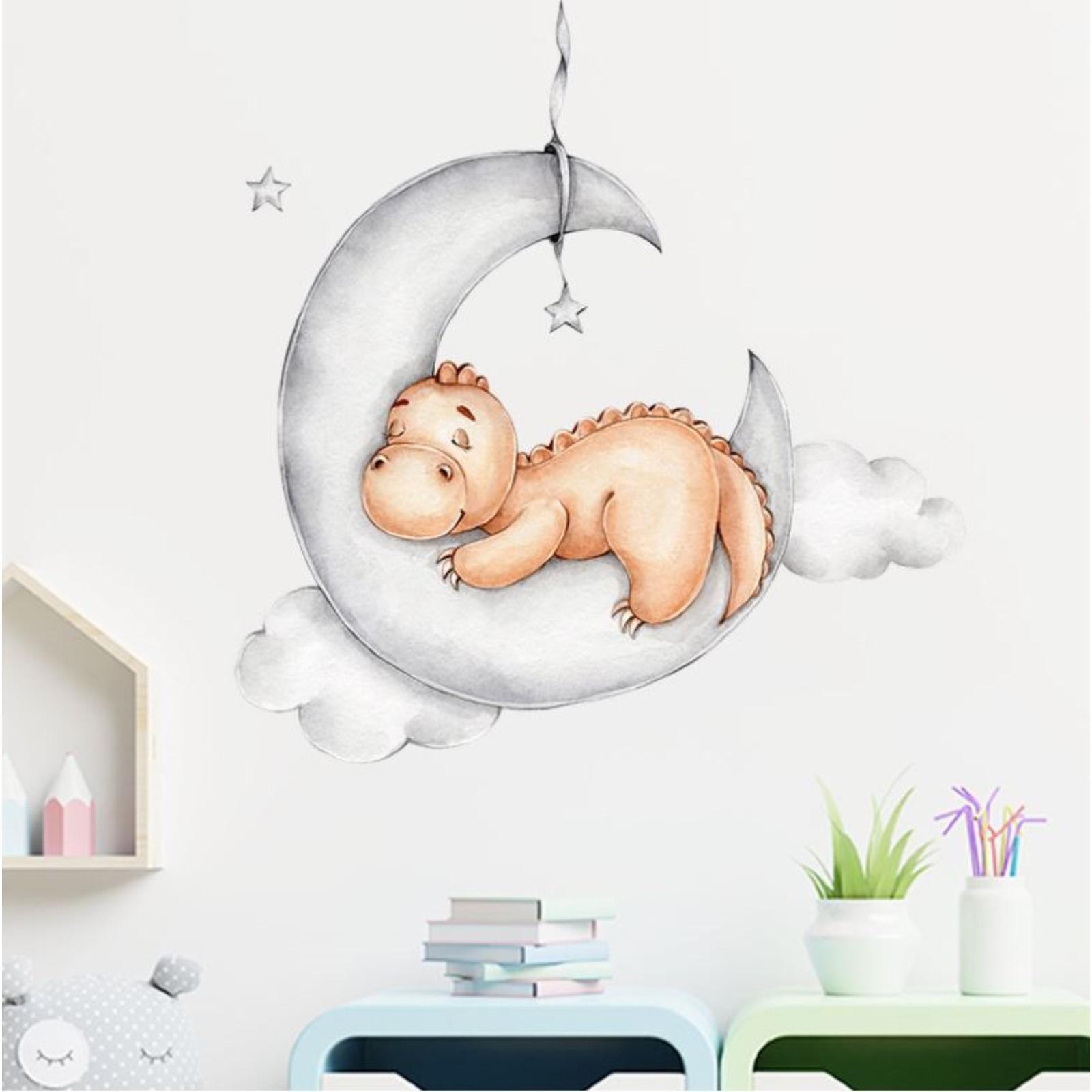 Наклейка пластик интерьерная цветная "Спящий динозаврик на месяце" 30х60 см