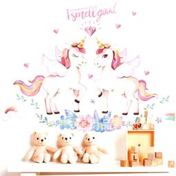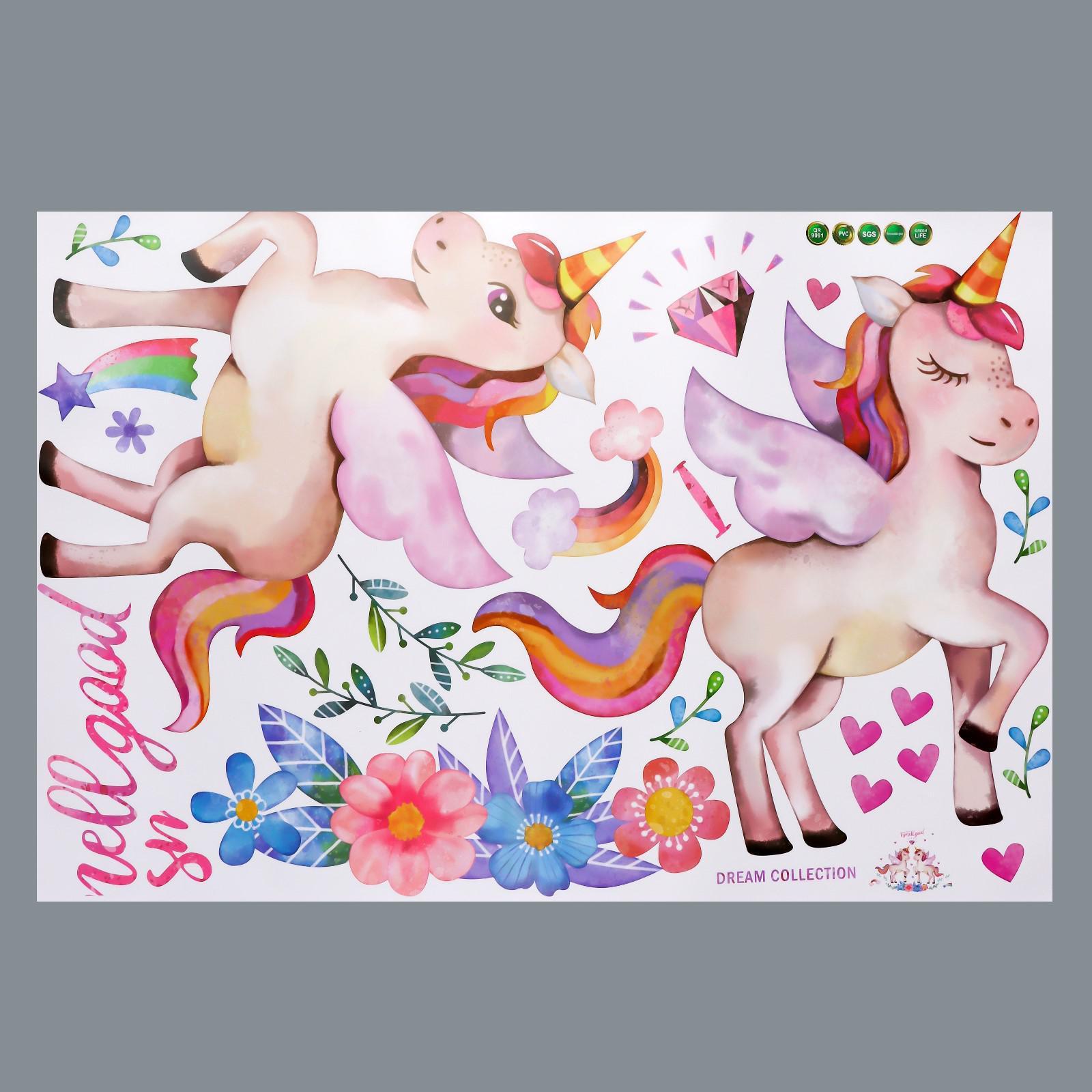 Наклейка пластик интерьерная цветная "Единороги с цветами, сердцами, радугой" 60х90 см