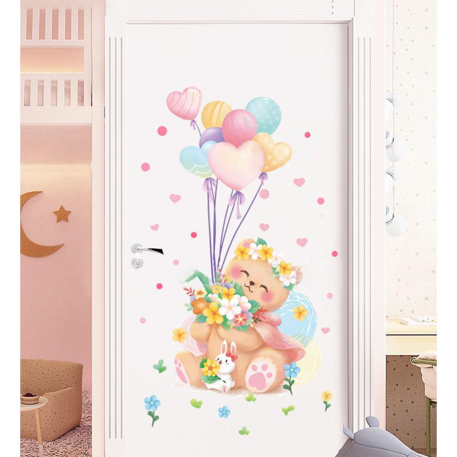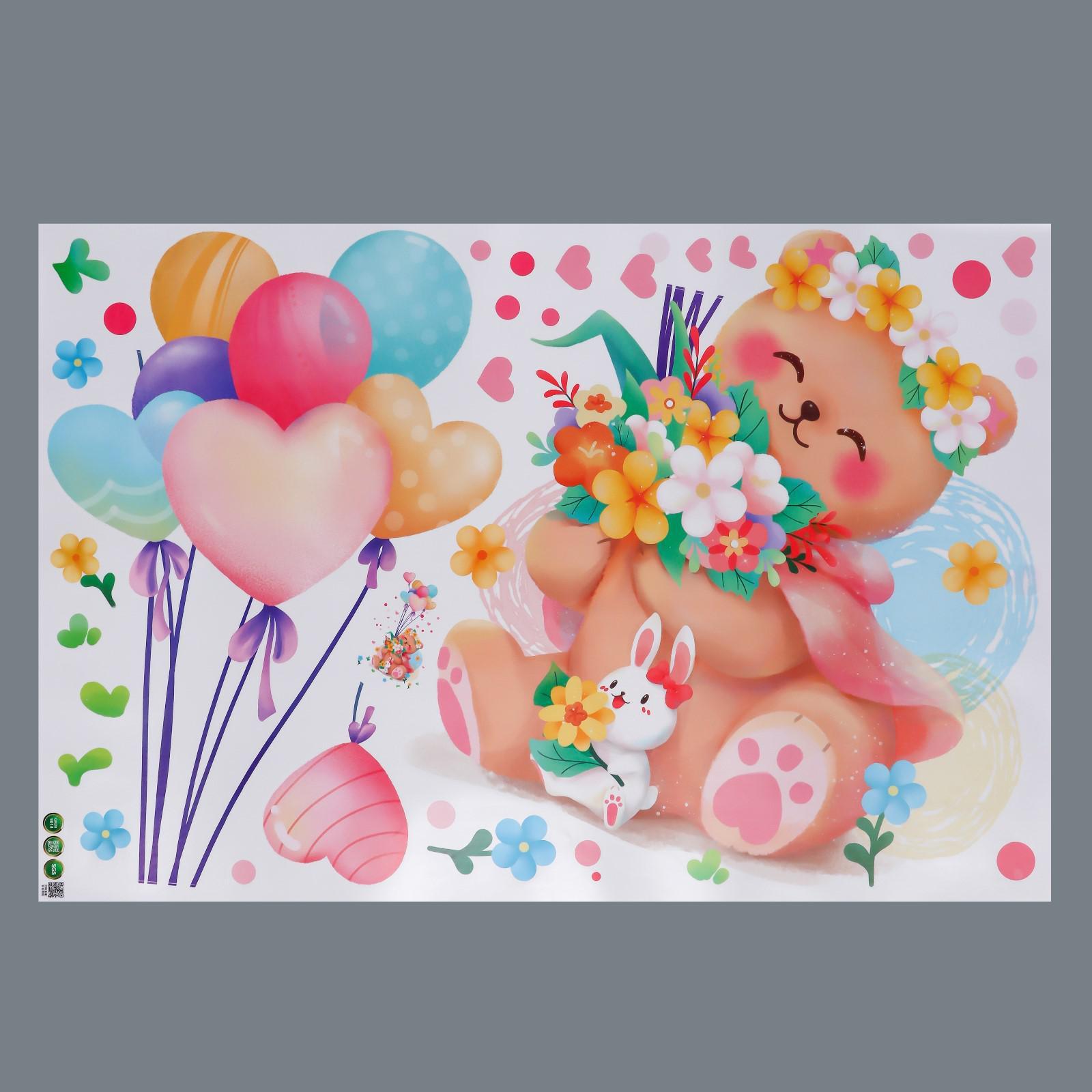 Наклейка пластик интерьерная цветная "Медвежонок с охапкой цветов и шариками" 60х90 см