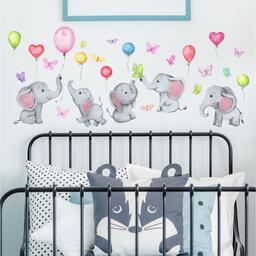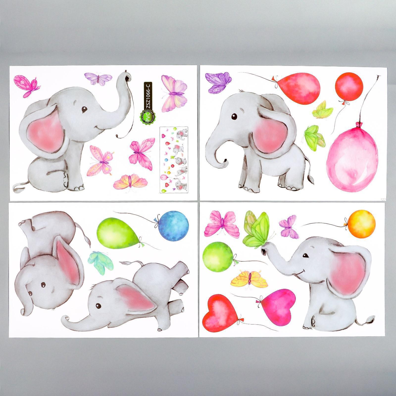 Наклейка пластик интерьерная цветная "Слонята с воздушными шариками" 25х35 см набор 4 листа 677037