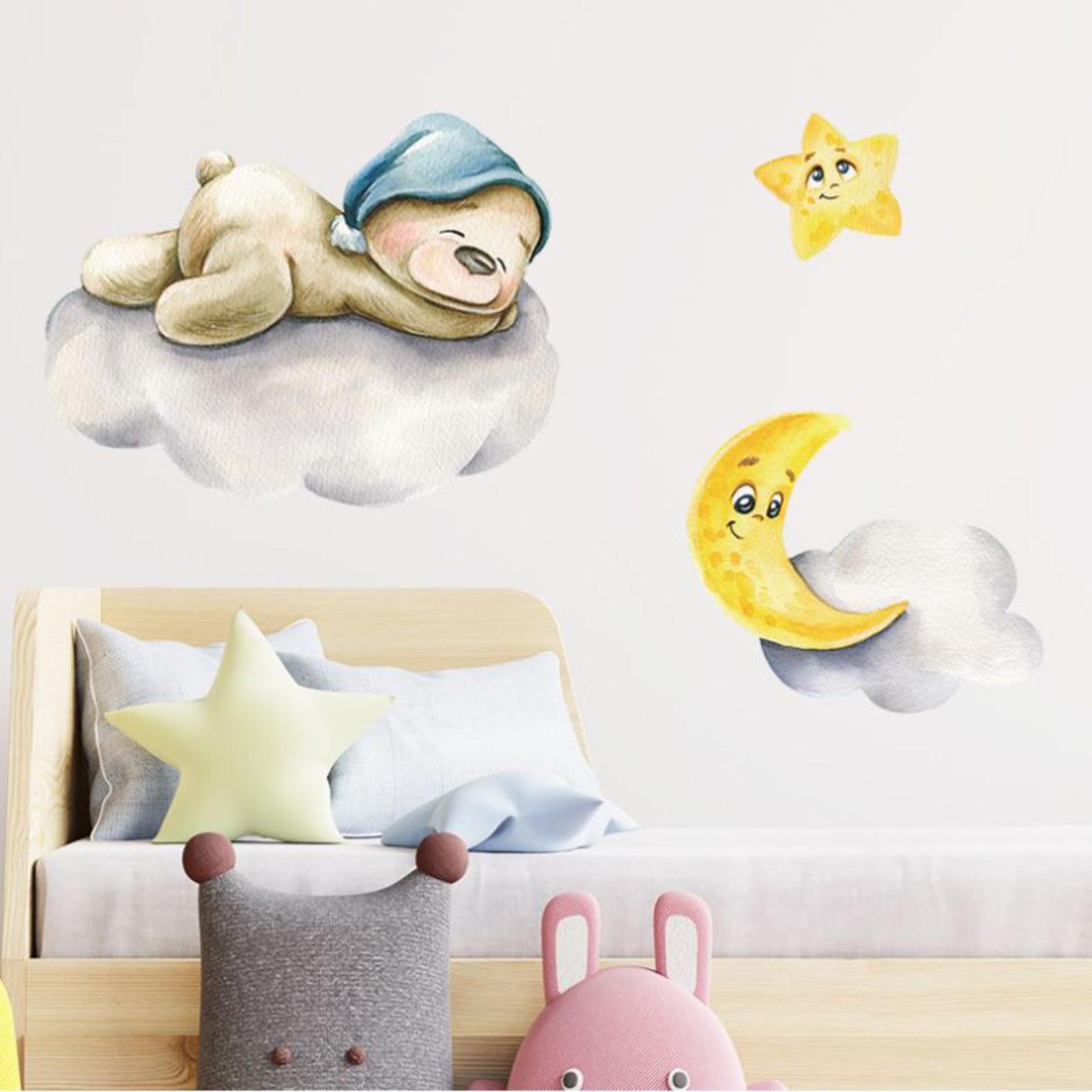 Наклейка пластик интерьерная цветная "Спящий мишка в колпаке, на облаке" 35х60 см