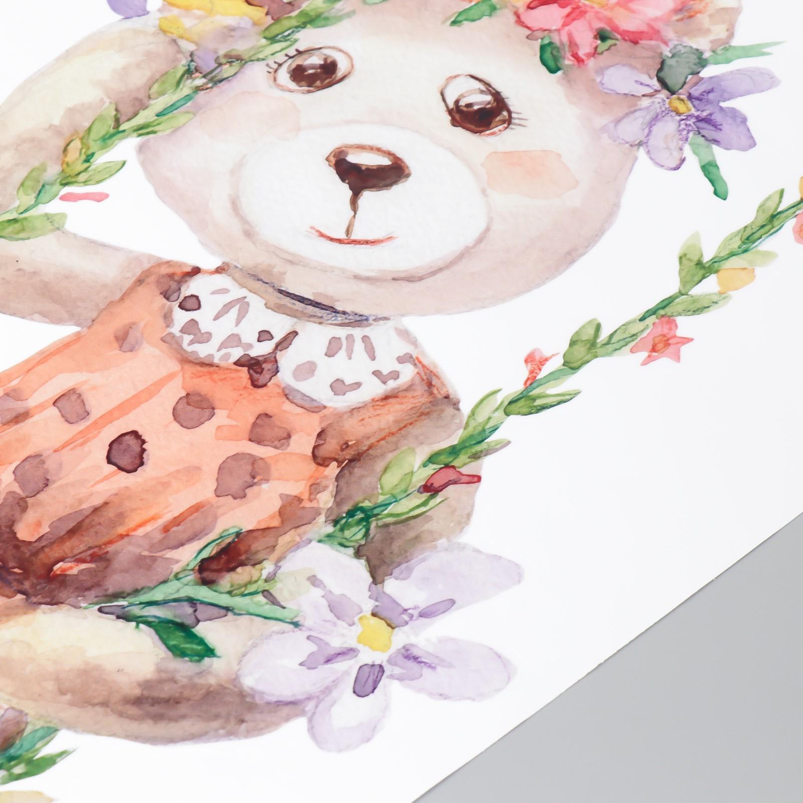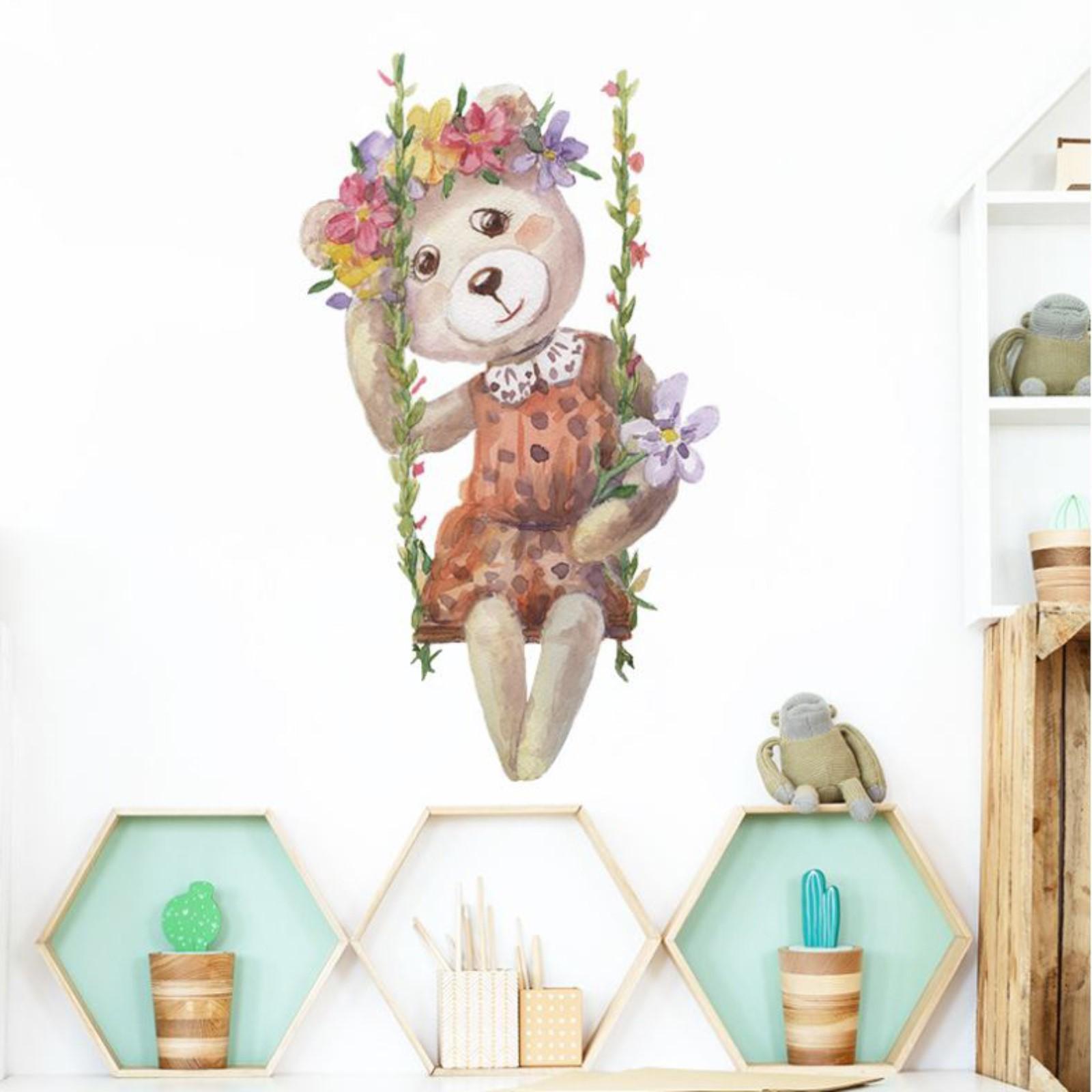 Наклейка пластик интерьерная цветная "Ретро. Медведица на качелях с цветами" 35х60 см