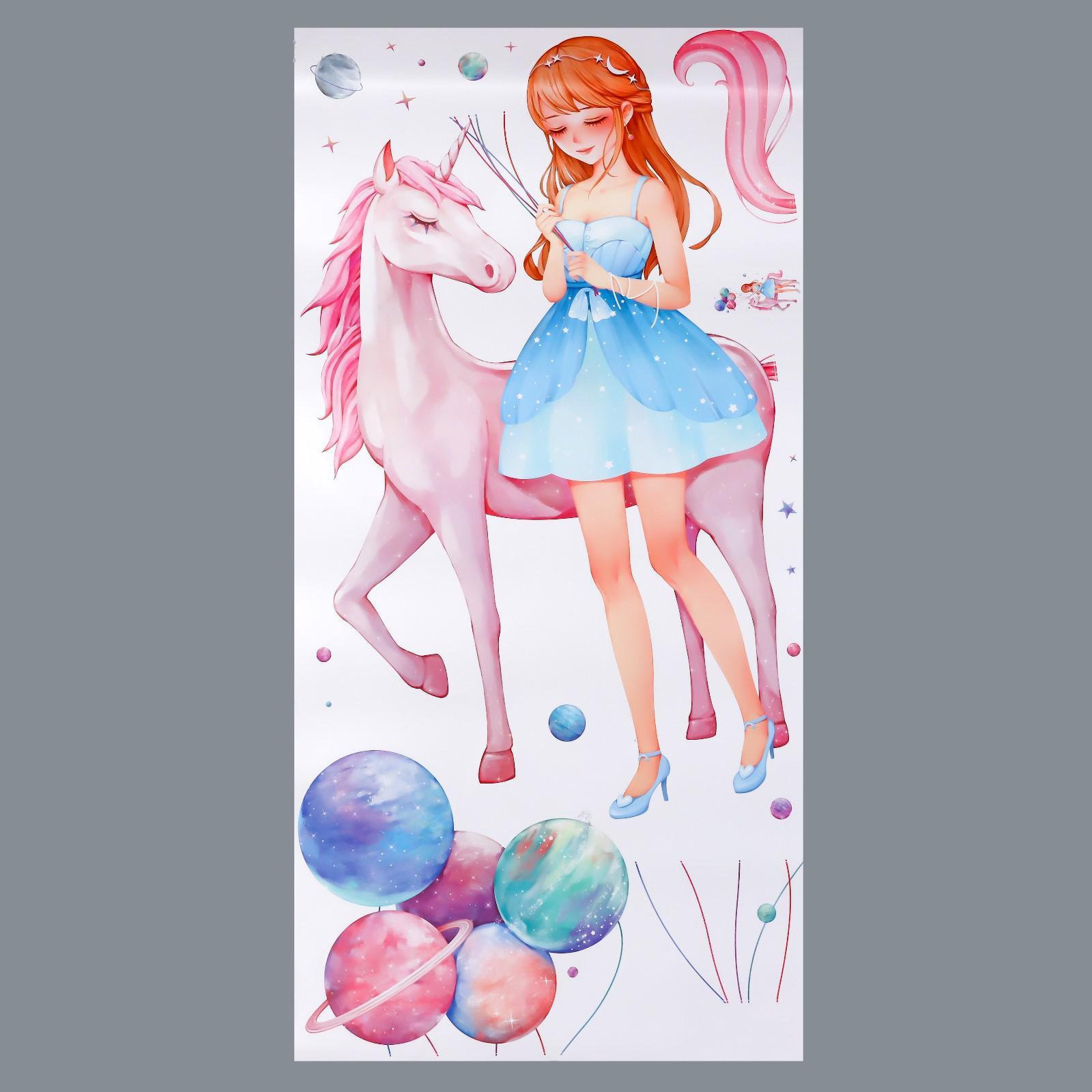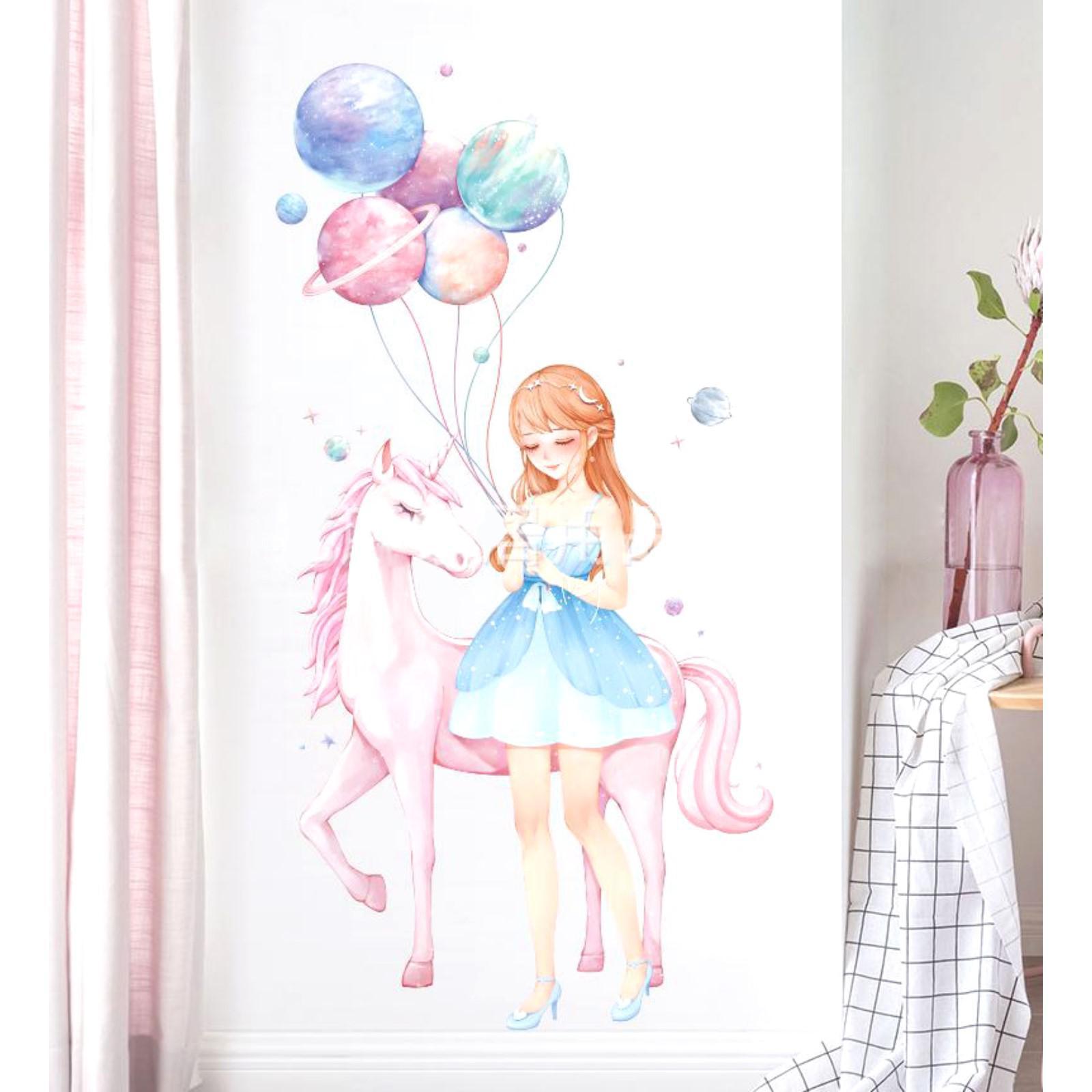 Наклейка пластик интерьерная цветная "Девушка с единорогом и шарами" 50х100 см
