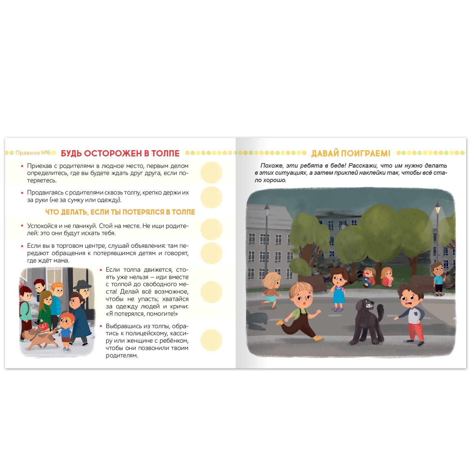 Эта полезная книжка расскажет малышу, как вести себя на улице, чтобы не попасть в беду. Внутри есть задания с наклейками — они помогут крохе запомнить правила в форме весёлой игры.