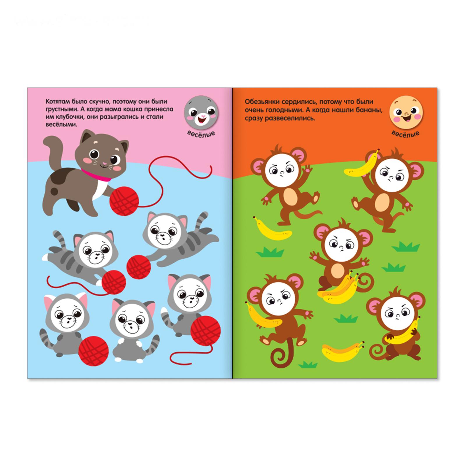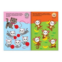 Внутри книги малыша ждут интересные задания, в которых нужно подобрать наклейки по форме, цвету и смыслу и приклеить в определённое место.
