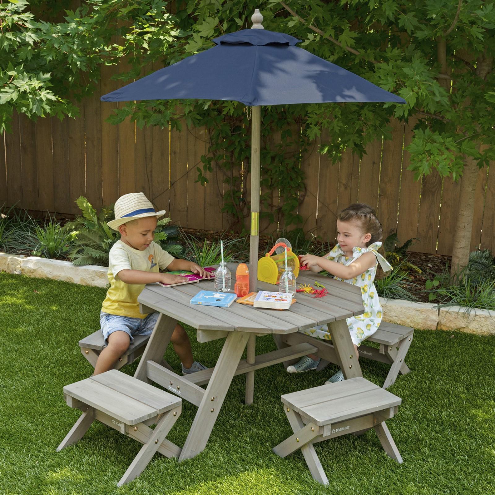 Детская садовая мебель, 4 скамьи, стол-пикник, зонт, бежево-коричневый