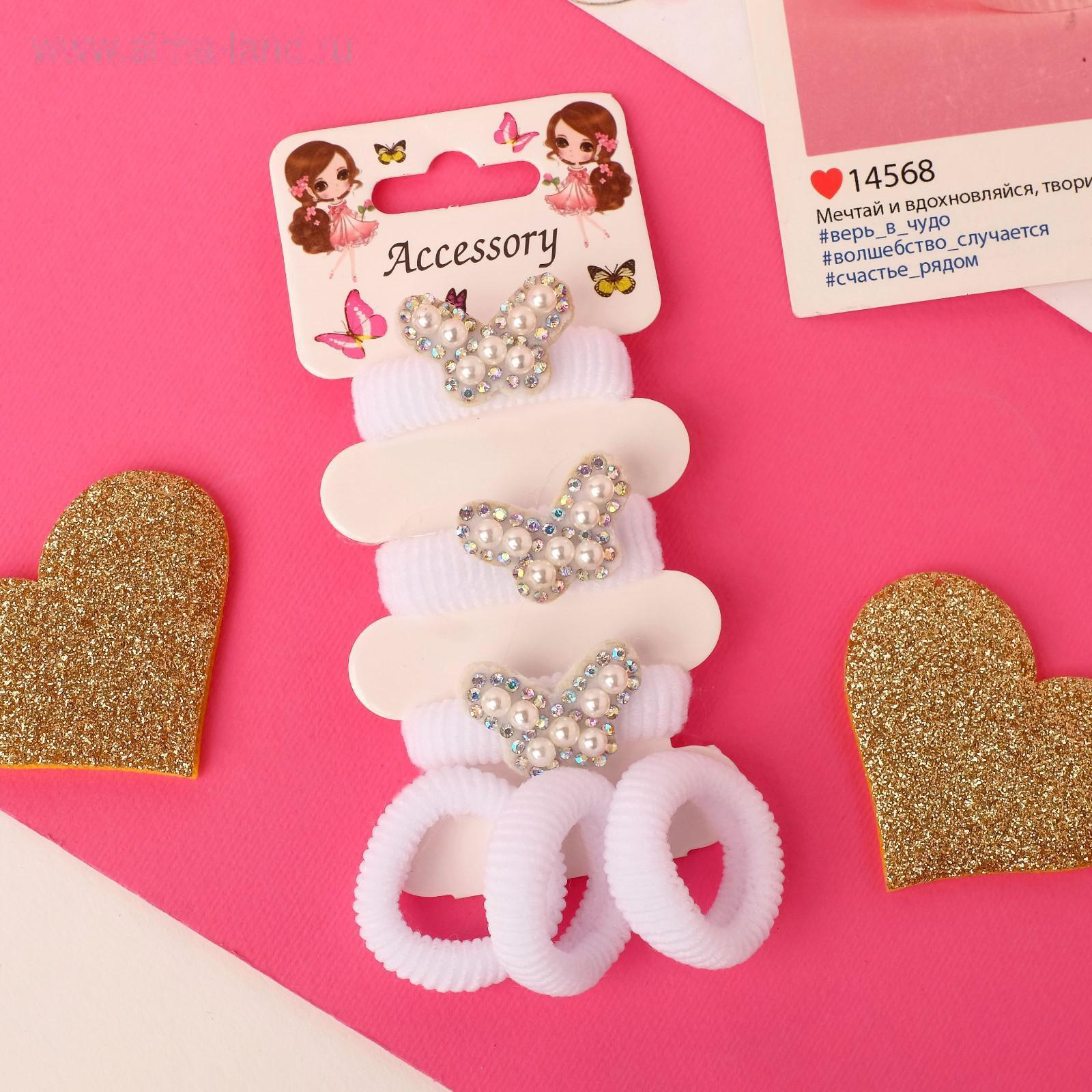 Резинка для волос "Лола" (набор 6 шт) бабочки жемчуг, белый