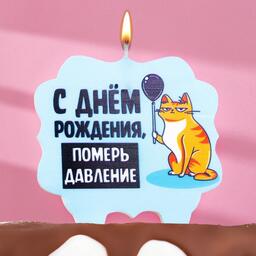 Свеча для торта "С днем рождения, померь давление", кот, 10х10 см, голубая