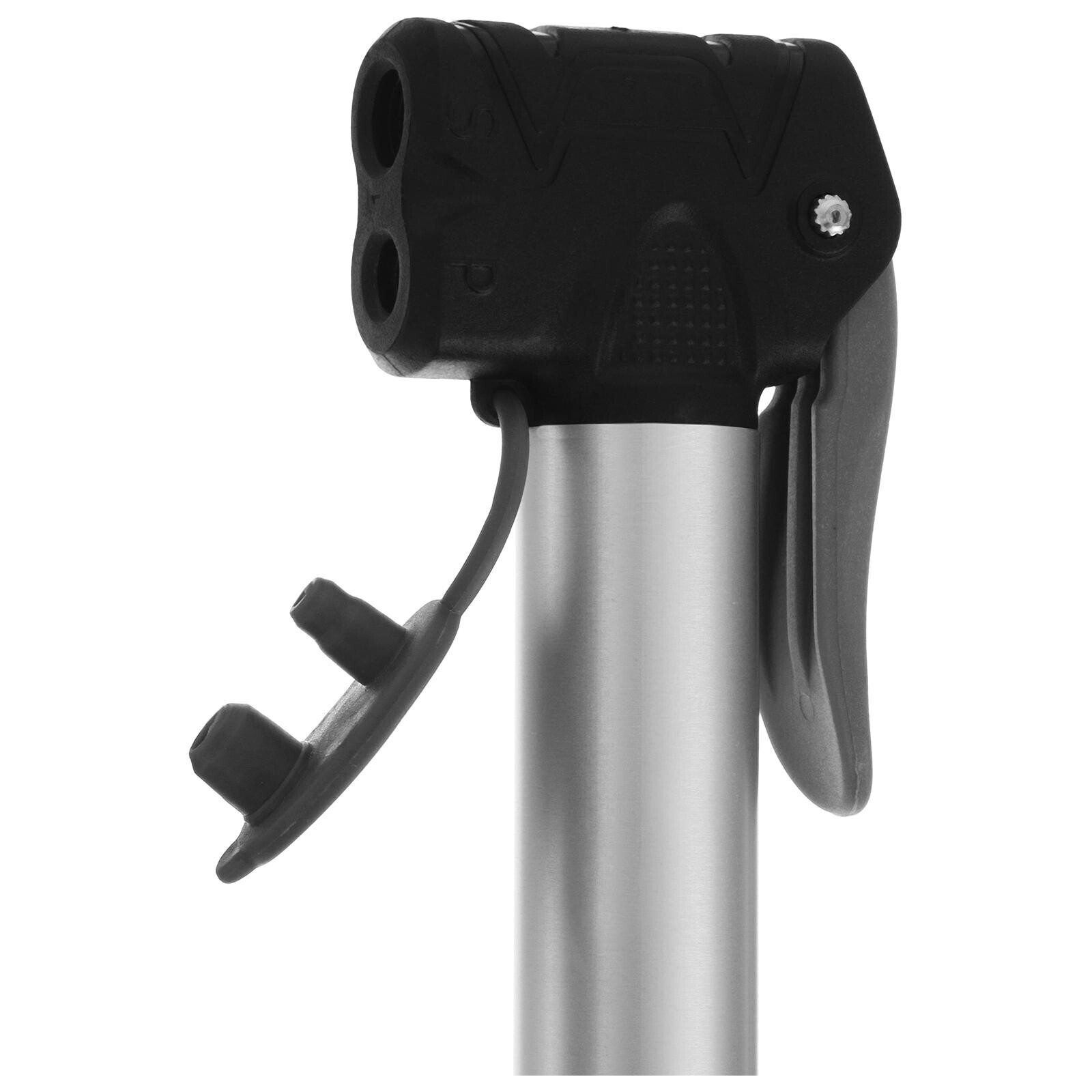 Выбрать соединение, подходящее под ниппель вашей камеры (верхнее отверстие: автомобильный ниппель (schrader) и нижнее отверстие: ниппель Presta). Прикрепить насос к клапану с помощью черного рычага. Накачивать до достижения необходимого давления.