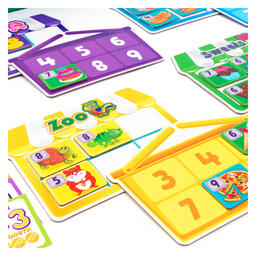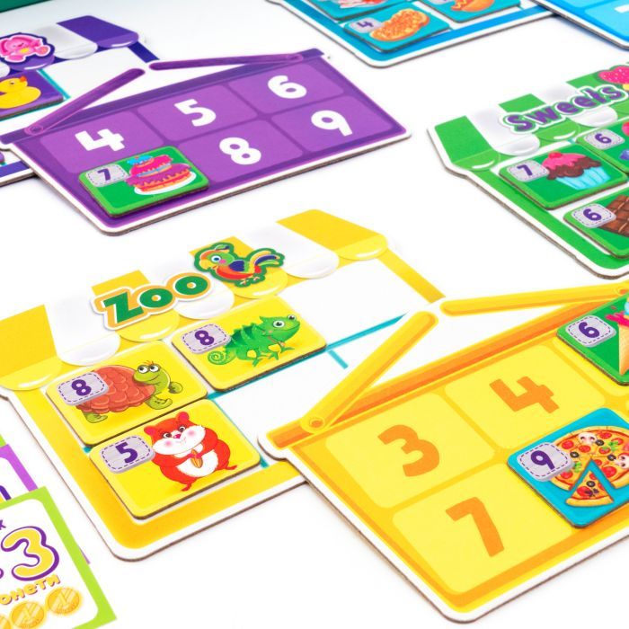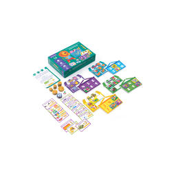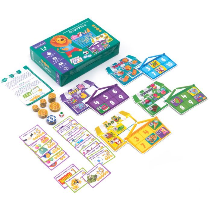 Комплектація: 4 картки з магазинами, 4 картки з кошиками, 84 деталі, 1 гральний кубик, 18 карток із завданнями, інструкція.