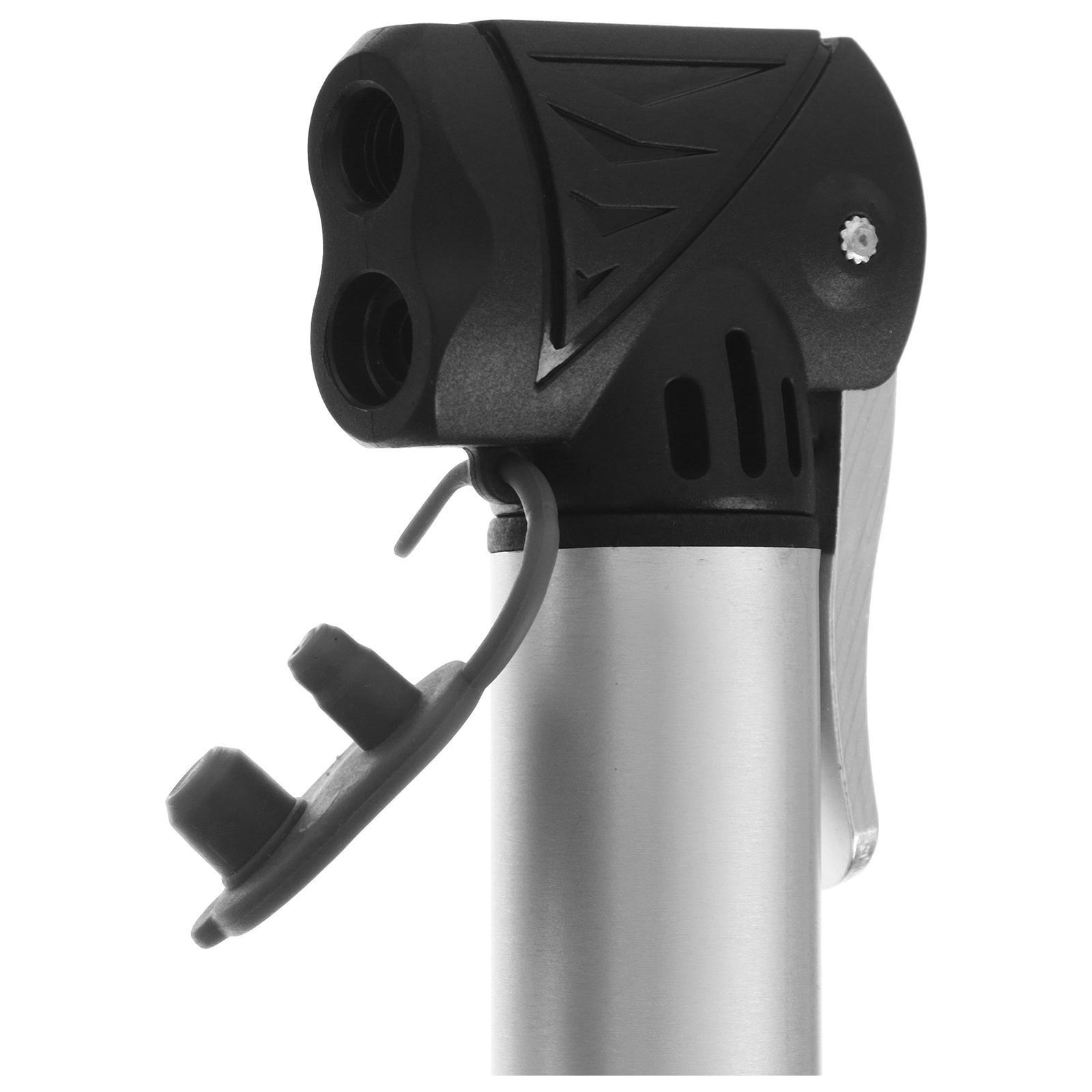 Выбрать соединение, подходящее под ниппель вашей камеры (верхнее отверстие: автомобильный ниппель (schrader) и нижнее отверстие: Клапан Presta). Прикрепить насос к клапану с помощью чёрного рычага. Накачивать до достижения необходимого давления.