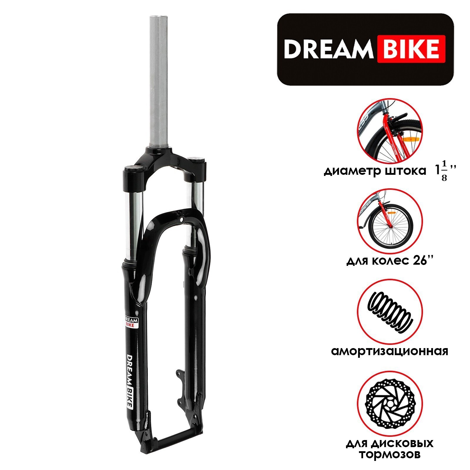 Вилка амортизационная 26" Dream Bike, шток 1"-1/8, алюминиевая корона, под диск