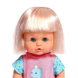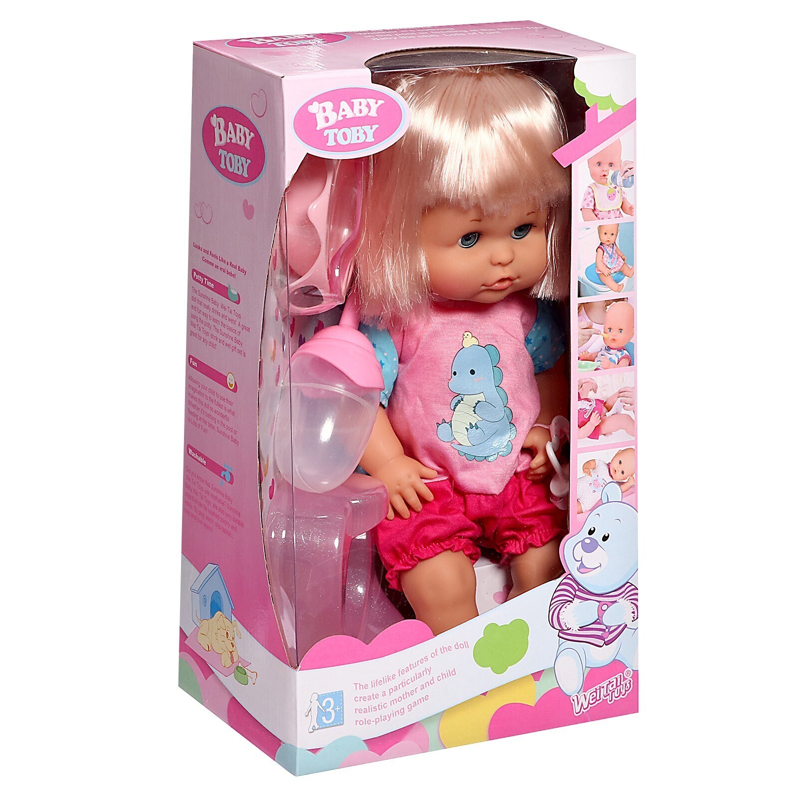 Кукла пьёт из бутылочки, закрывает глаза, писает напрямую (кнопки нет). Ребёнок покормит пупса, посадит его на горшок, искупает в ванной и поменяет ему подгузник. А ещё расчешет волосы и заплетёт косичку.