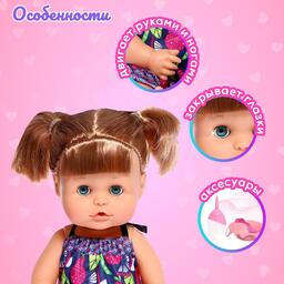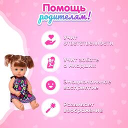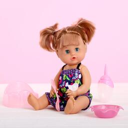 Кукла пьёт из бутылочки, закрывает глаза, писает напрямую (кнопки нет). Ребёнок покормит пупса, посадит его на горшок, искупает в ванной и поменяет ему подгузник. А ещё расчешет волосы и заплетёт косичку.