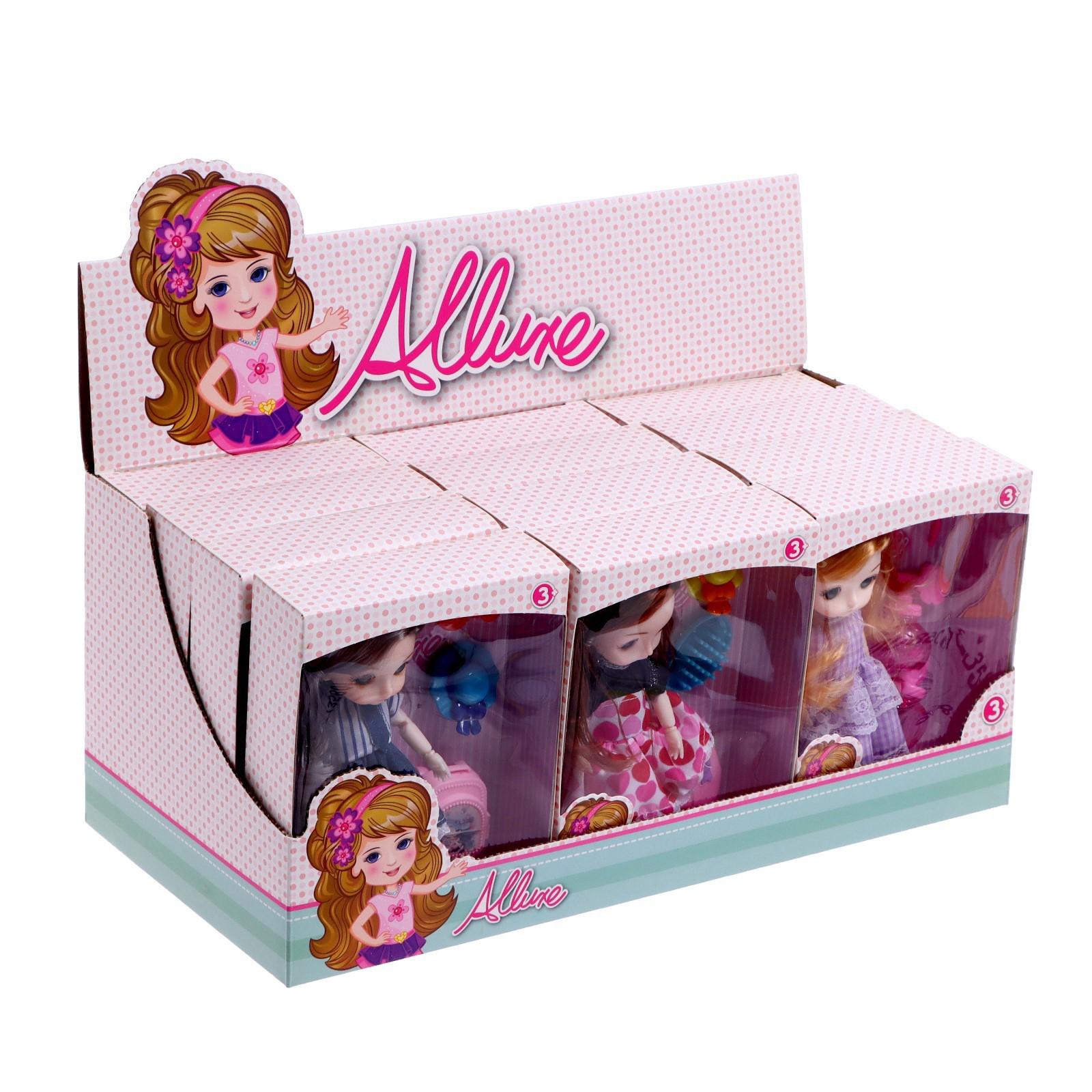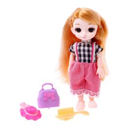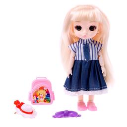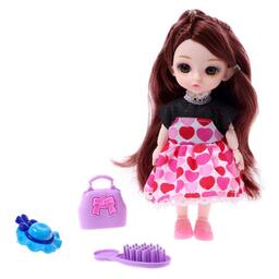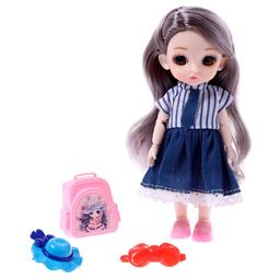 Кукла шарнирная полностью, высота — 15 см. В комплекте представлены разные аксессуары, варианты микс: портфельчик, заколочки, духи, расчёска.