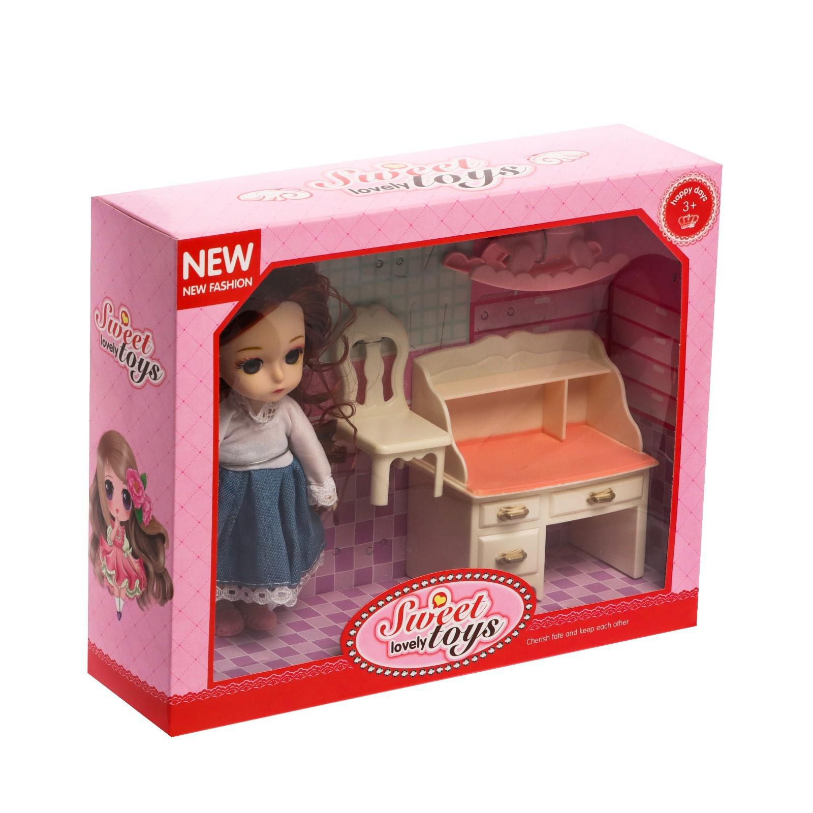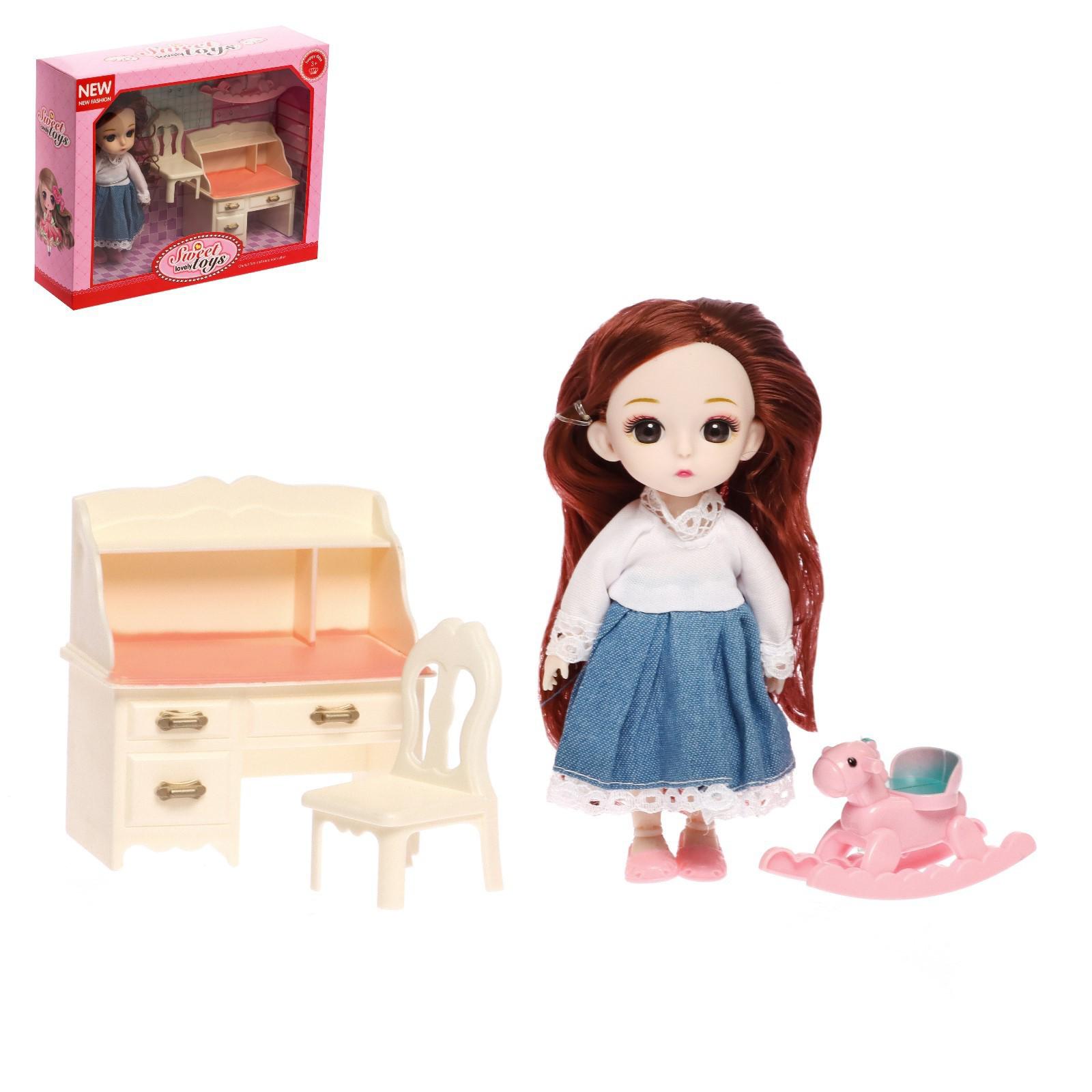 В комплект входят пластиковые аксессуары: лошадка-качалка, стульчик, письменный стол. Они выполнены без зазубрин, острых углов и безопасны для малышки.